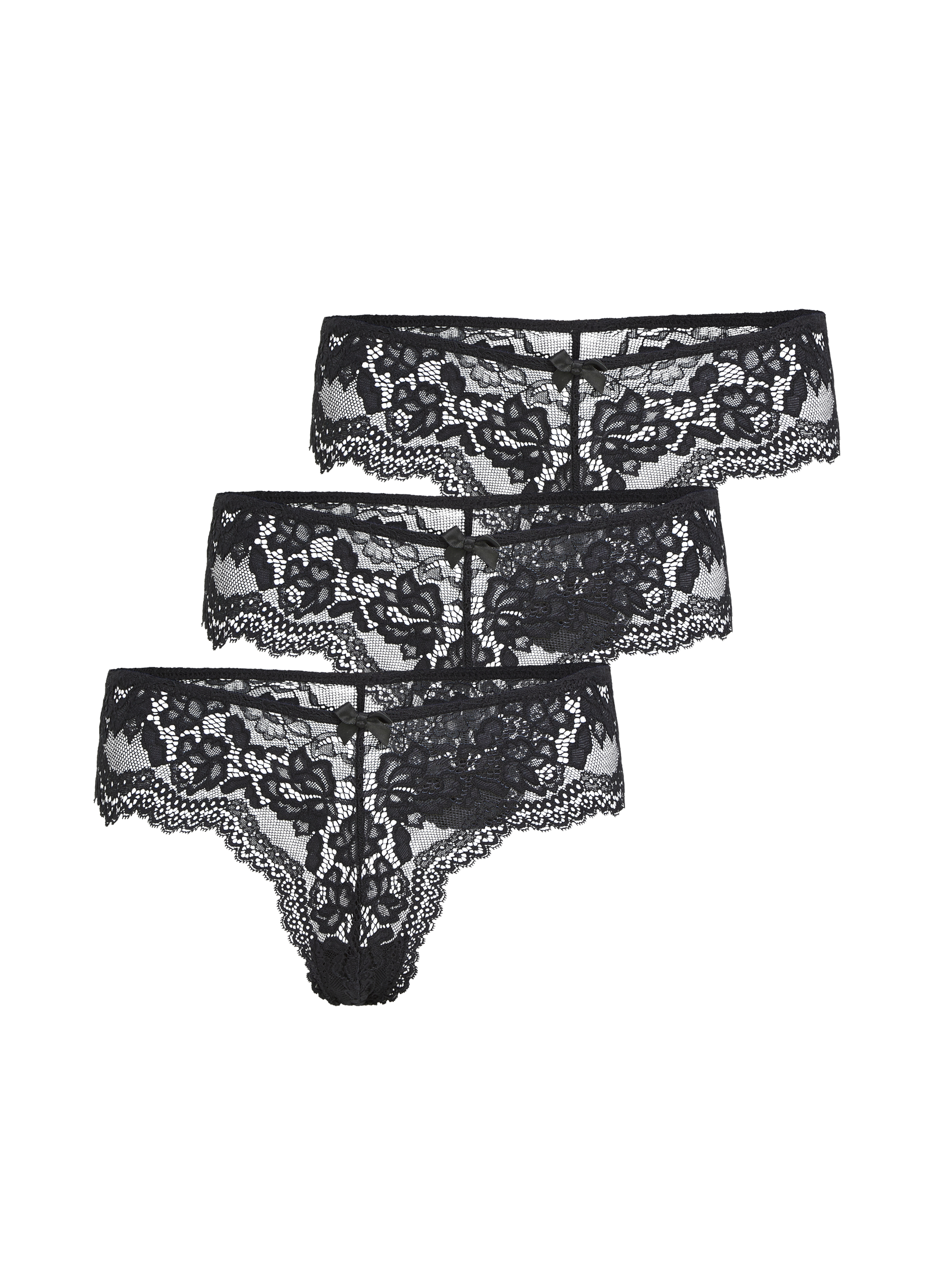 Feel sexy in these Brazilians! They are fully finished with lace and have a small bow on the front as an extra detail. Handy in a 3-pack, so you will look fabulous every day.