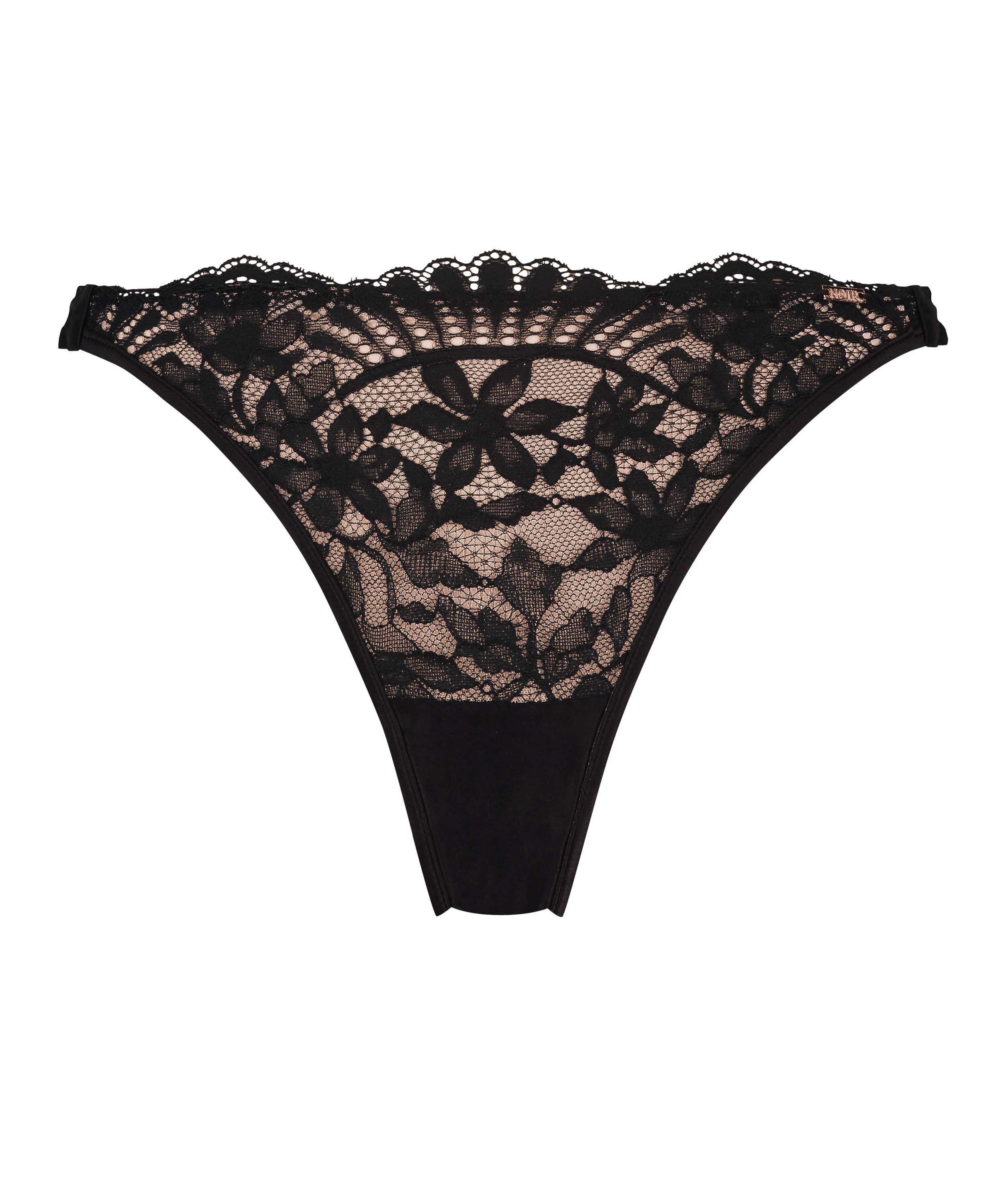 Boost your confidence in this sexy thong! This thong has mesh straps and beautiful lace details in the front. This is part of the Noir collection and can be combined with the matching bra!