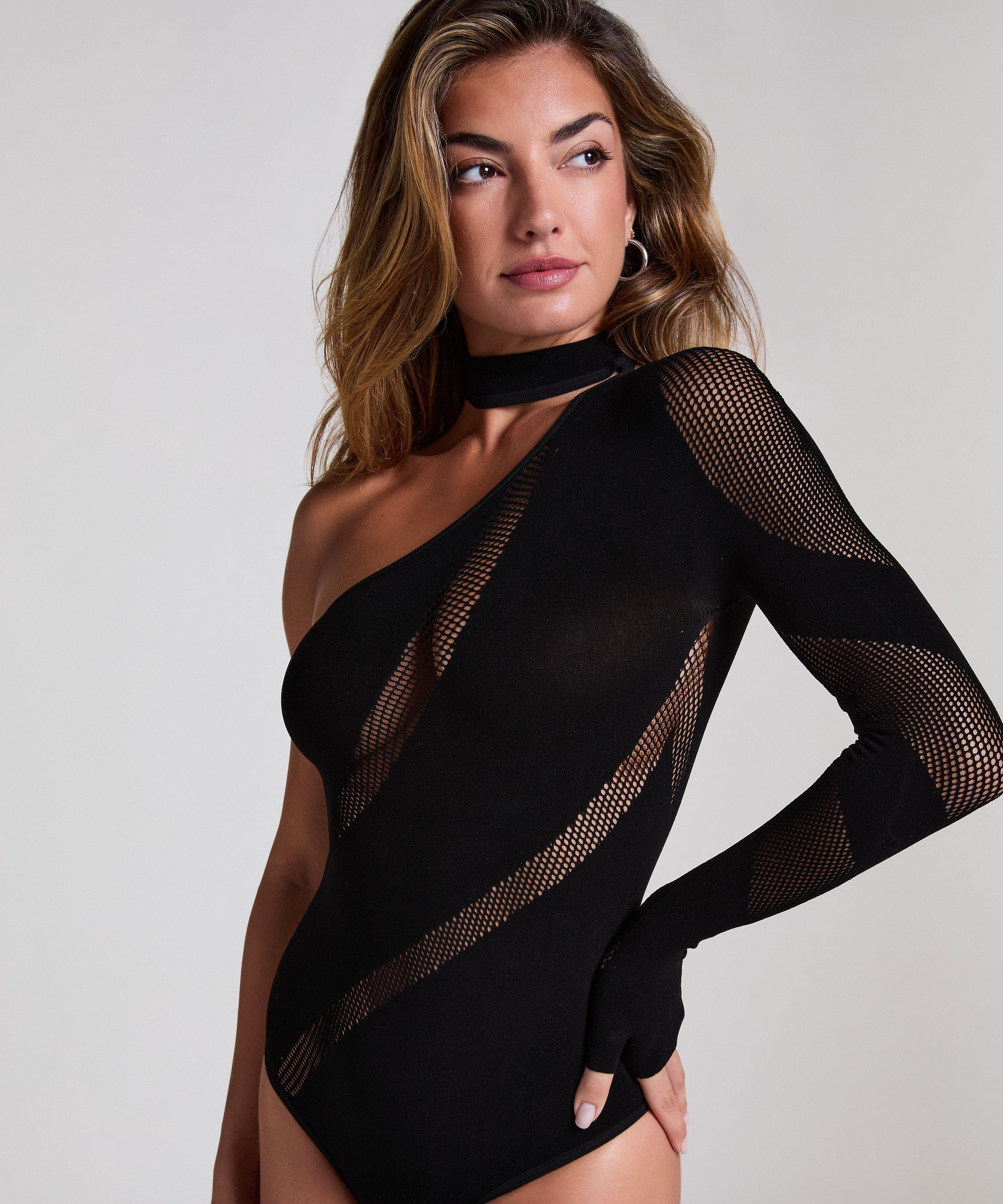 Make a bold statement with this body. This design features asymmetrical styling and fishnet details that accentuate your curves. The single sleeve adds a modern touch.