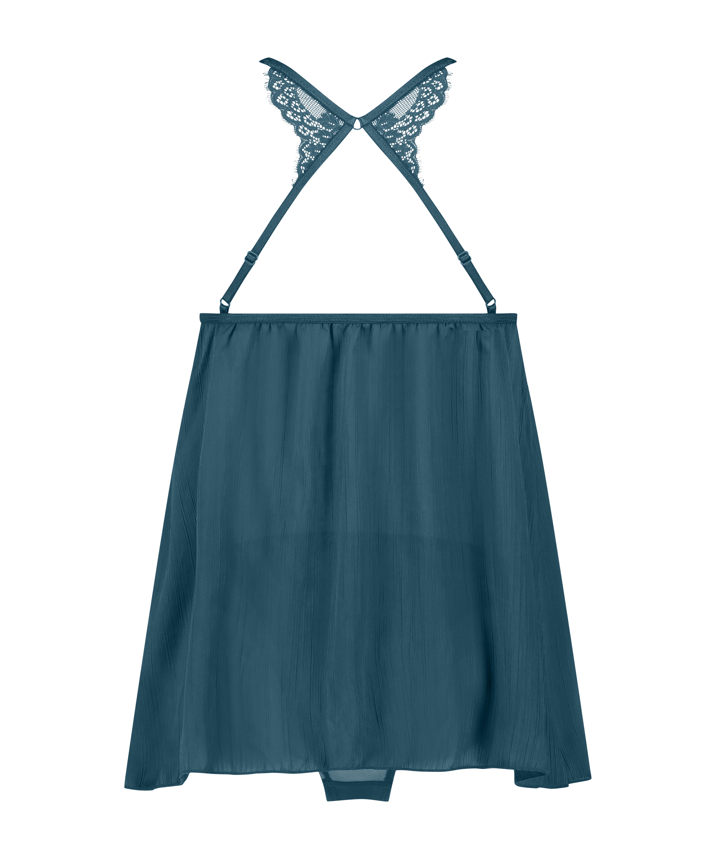 Feel sexy in this gorgeous baby doll! With a romantic lace look, front closure and cross strap back detail. We can't forget about the matching brazilian in the set!