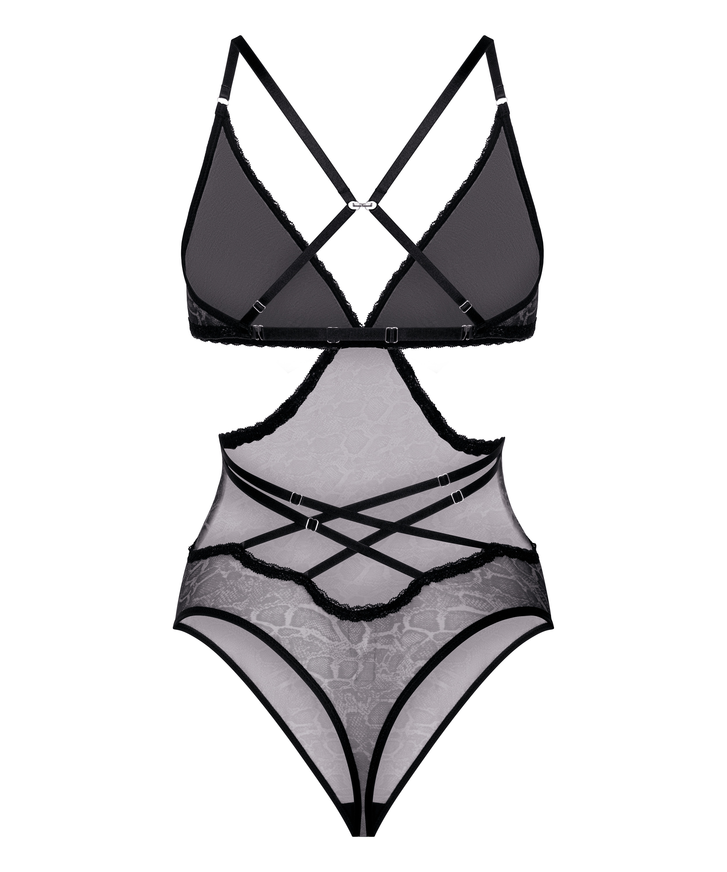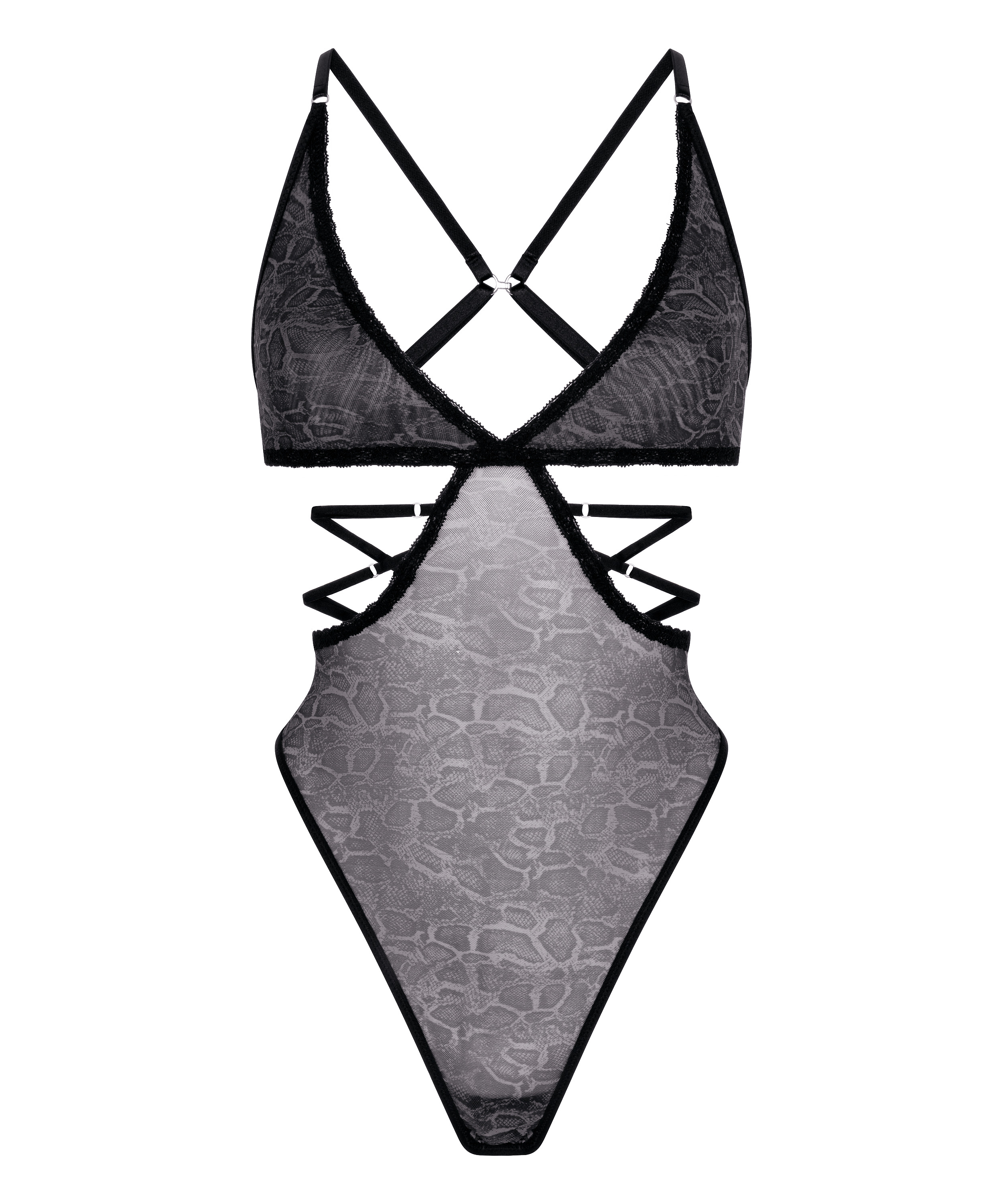 Dare to stand out with this seductive cut-out body, crafted from sheer mesh in a bold snake-skin print for an edgy, modern look. Feminine lace details soften the design, adding a romantic touch to its daring silhouette. Featuring strategic cut-outs that highlight your curves, this piece combines confidence and elegance effortlessly. Adjustable straps ensure a perfect fit, making it ideal for layering or wearing as a statement lingerie piece. Add it now to your wardrobe collection!