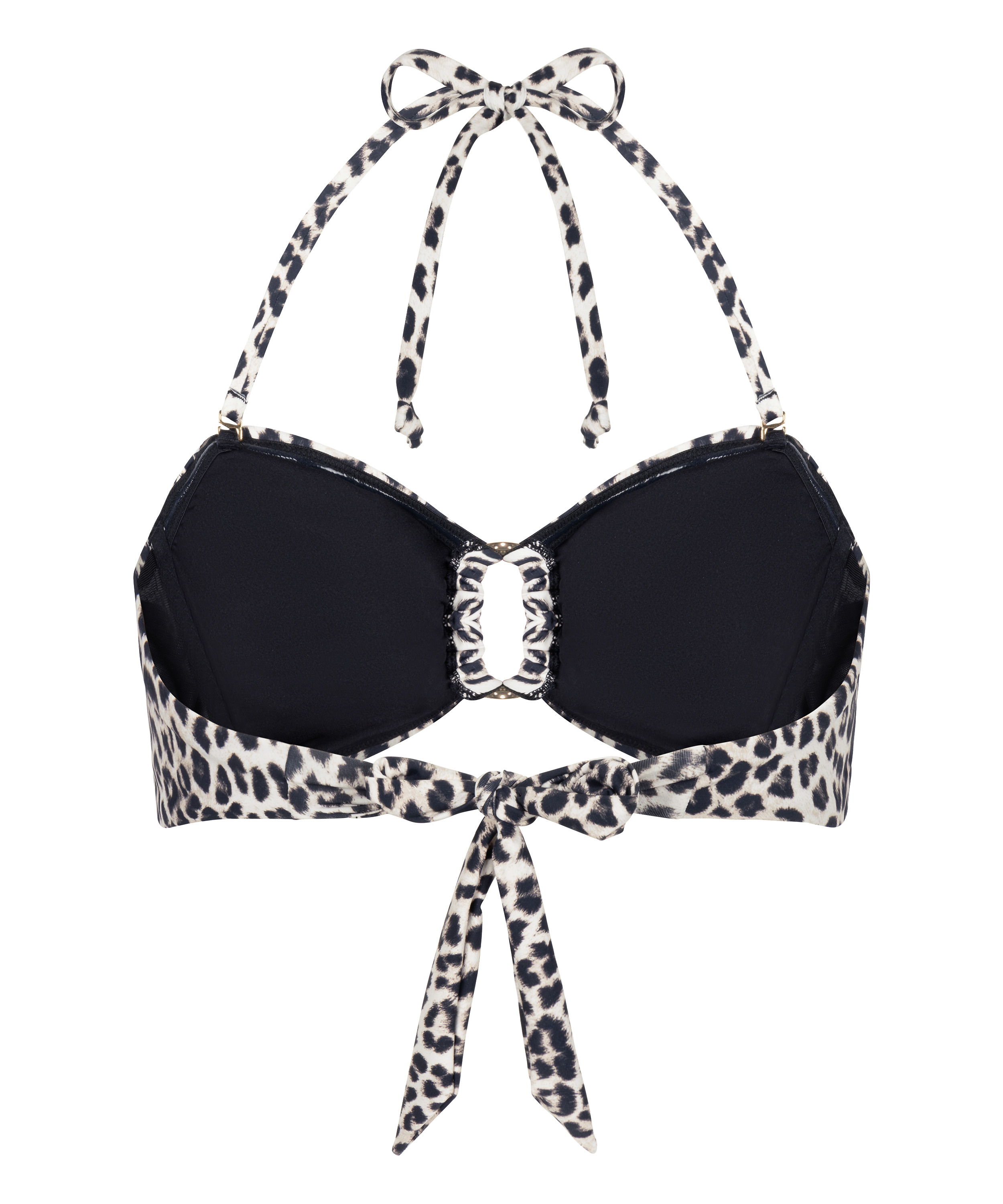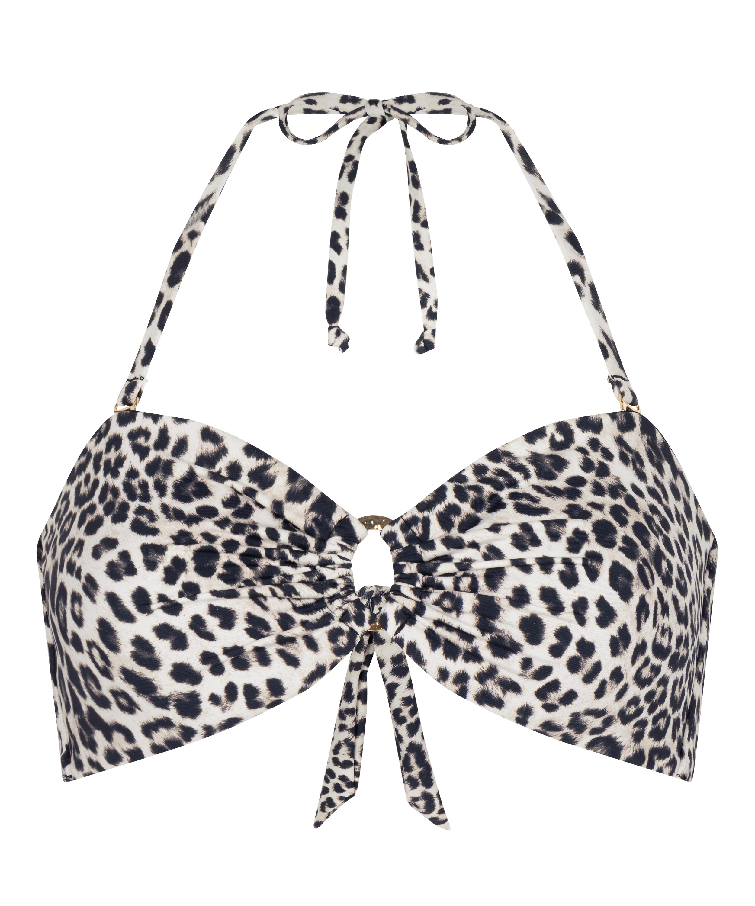 This padded, non-wired bandeau bikini top in leopard print combines comfort with bold, playful style. Featuring strings to tie around the neck and back, it allows for a fully adjustable, personalized fit. The soft padding provides gentle shaping while keeping a natural, relaxed feel. Perfect for swimming, sunbathing, or lounging, it pairs effortlessly with matching bottoms.