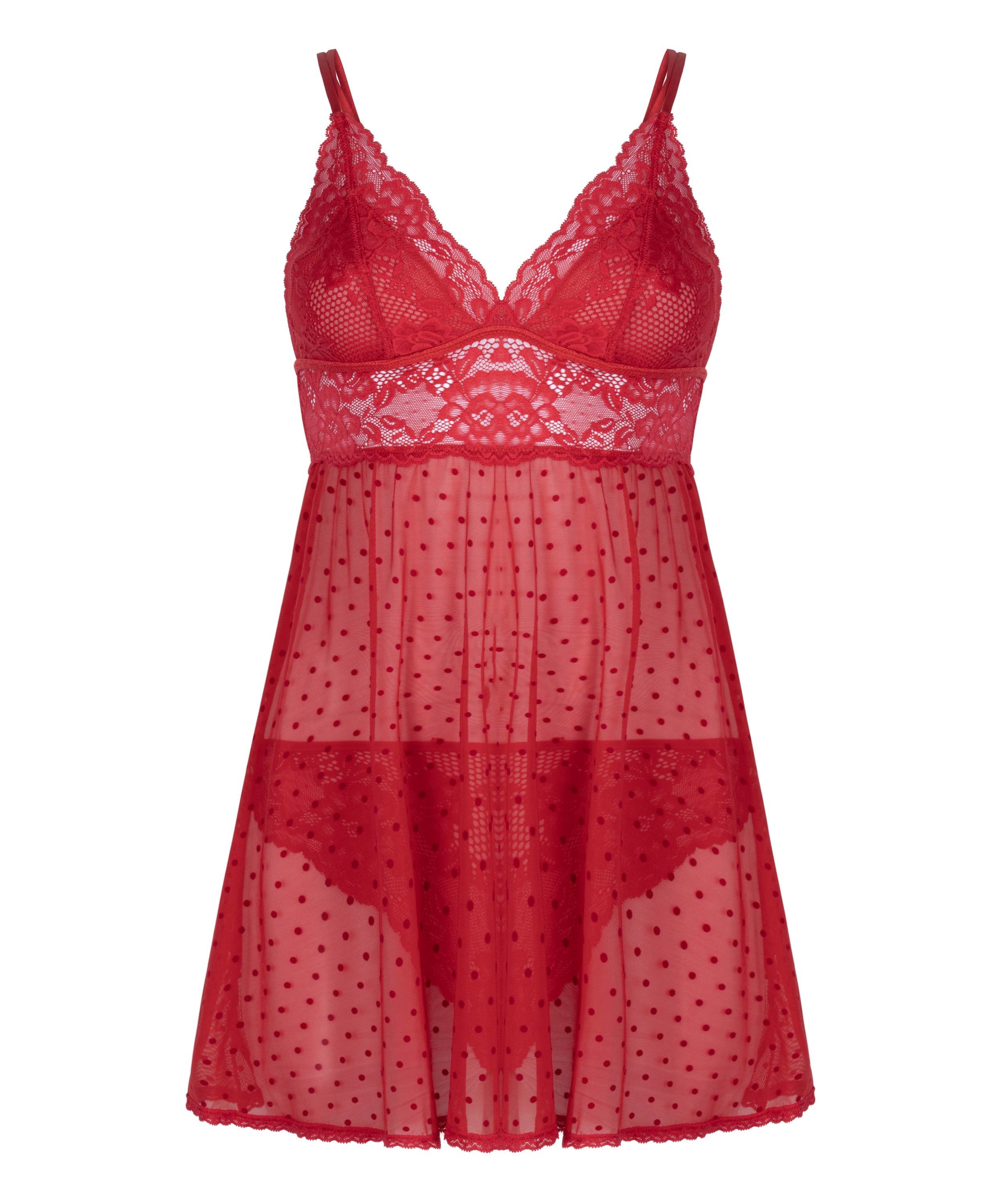 Feel sexy in this non-wired babydoll! The babydoll has lace and mesh detailing, adjustable straps and is finished in a polka dot pattern. The matching knickers are made of a mix of lace and mesh.