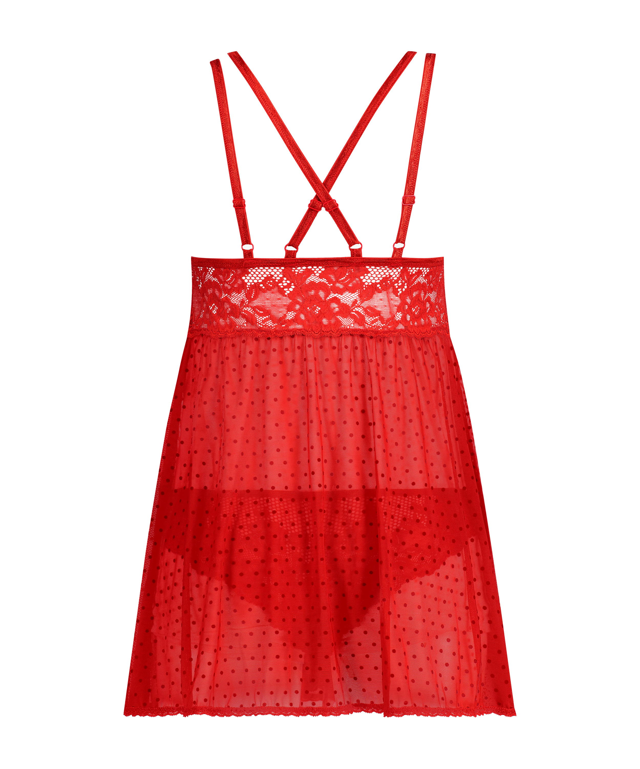 Feel sexy in this non-wired babydoll! The babydoll has lace and mesh detailing, adjustable straps and is finished in a polka dot pattern. The matching knickers are made of a mix of lace and mesh.