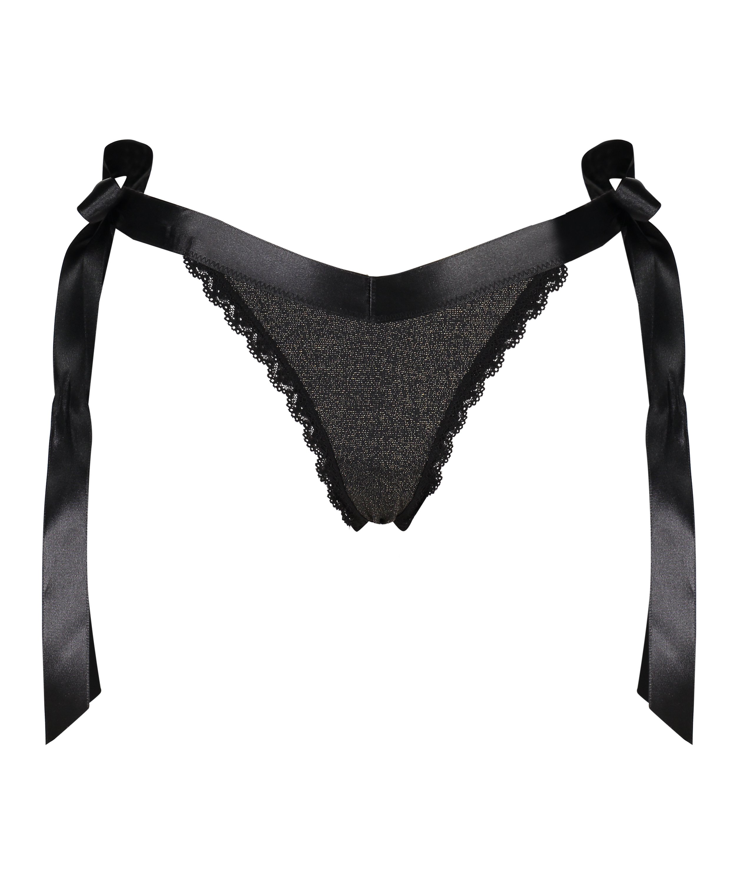 Get into the Christmas spirit with this thong! This glittery thong is trimmed with lace and satin. The bows on the sides add a sexy touch!