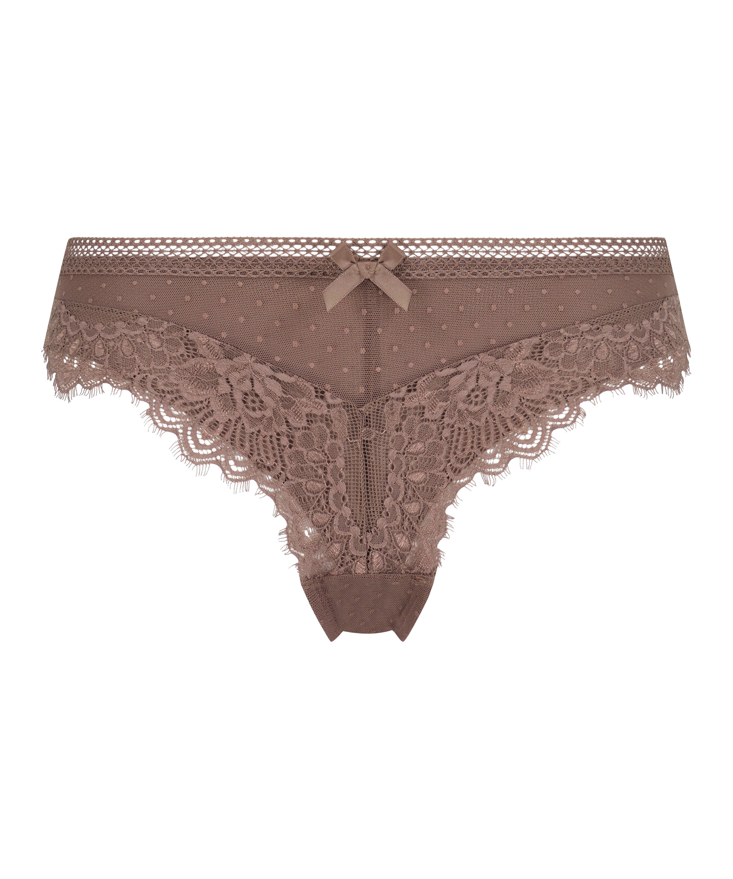 Looking for a graceful Brazilian? This is the perfect choice for you! It is almost completely covered with lace and a dot print. There's a little bow on the front. Combine this Brazilian with the matching bra to complete your set!