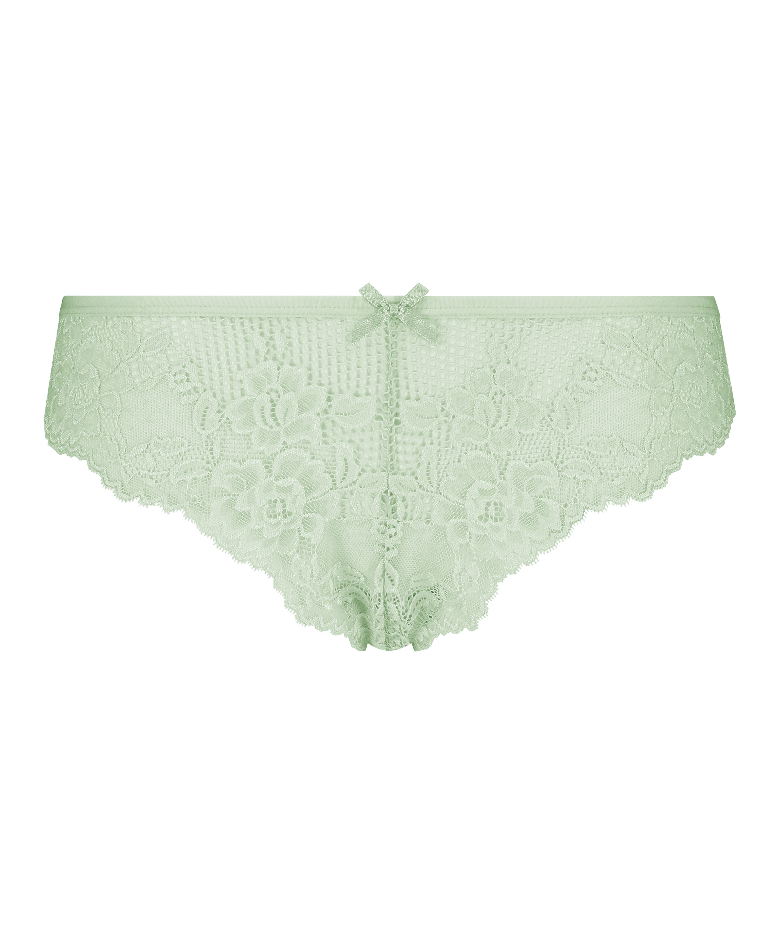 These semi-transparent Brazilian knickers are finished with lots of lace. The small bow on the front adds a finishing touch.