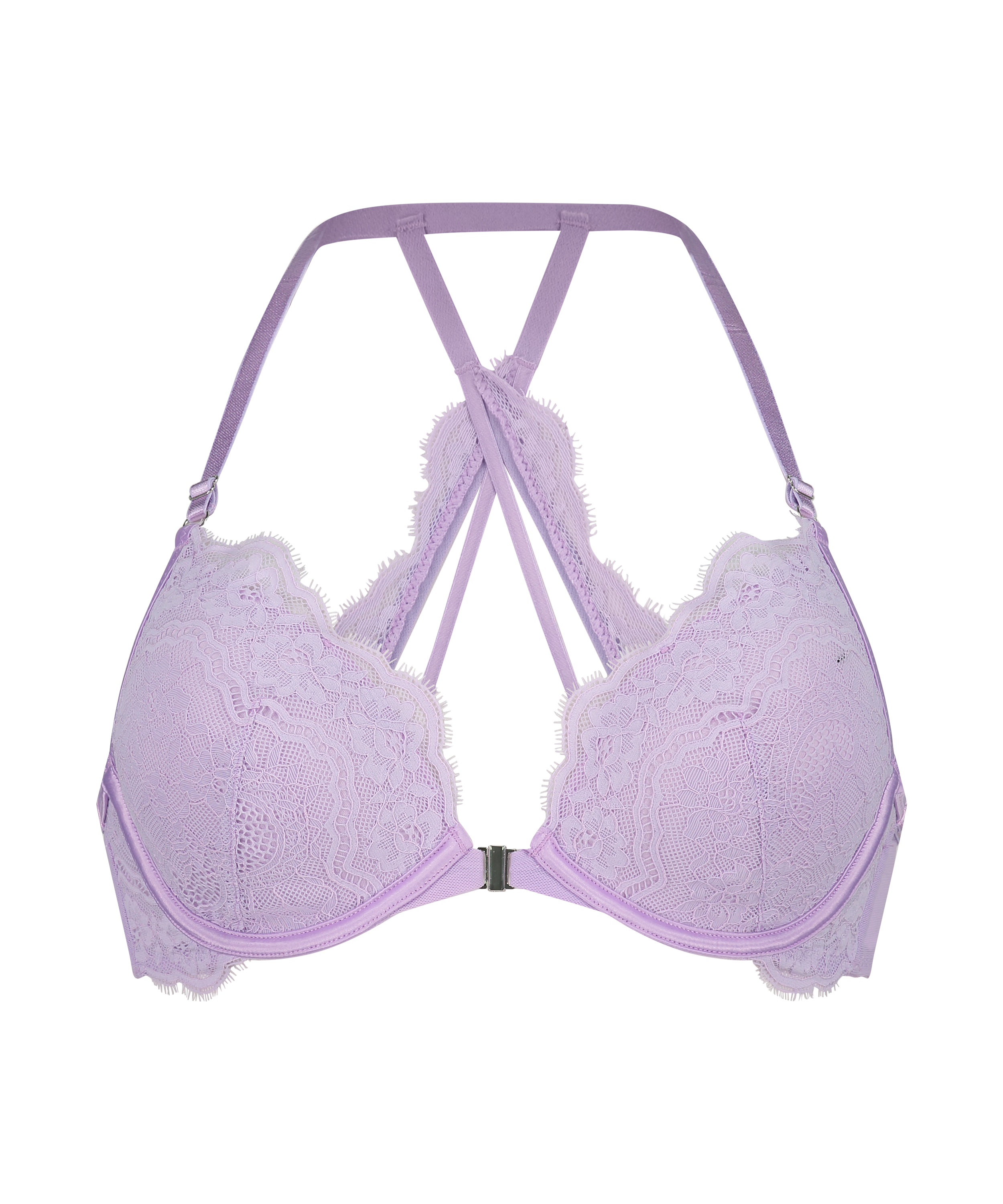 Feel confident in this super comfortable bra! With lots of beautiful lace. For easy wear, it has a frontal closure, leaving the back plenty of space for more lace. Try it with the matching knickers!