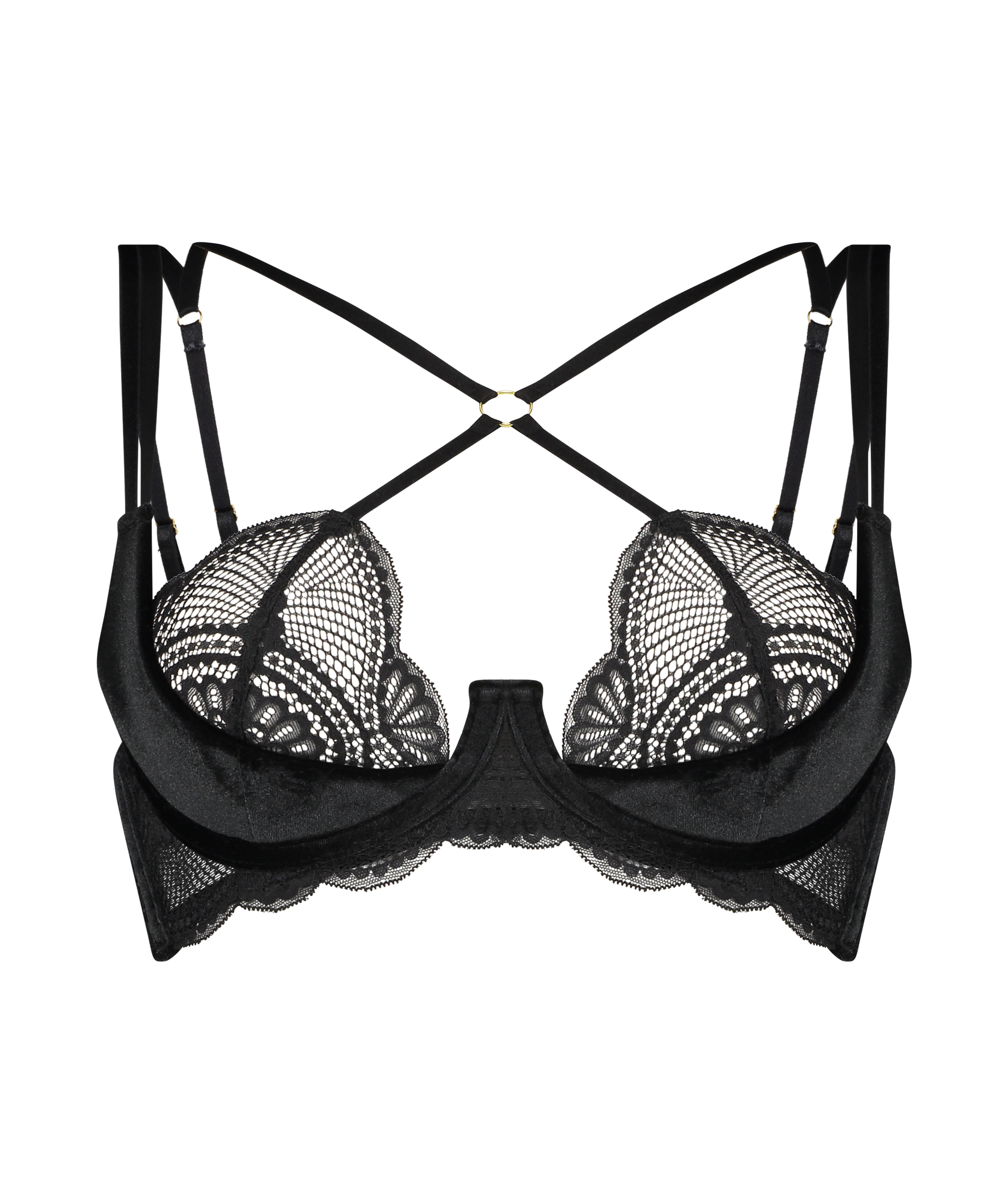 This bra is stunning and sexy at the same time! It is made of lace and velvet. The bra has seductive strappy details on the front. Combine with the matching knickers for a complete set!