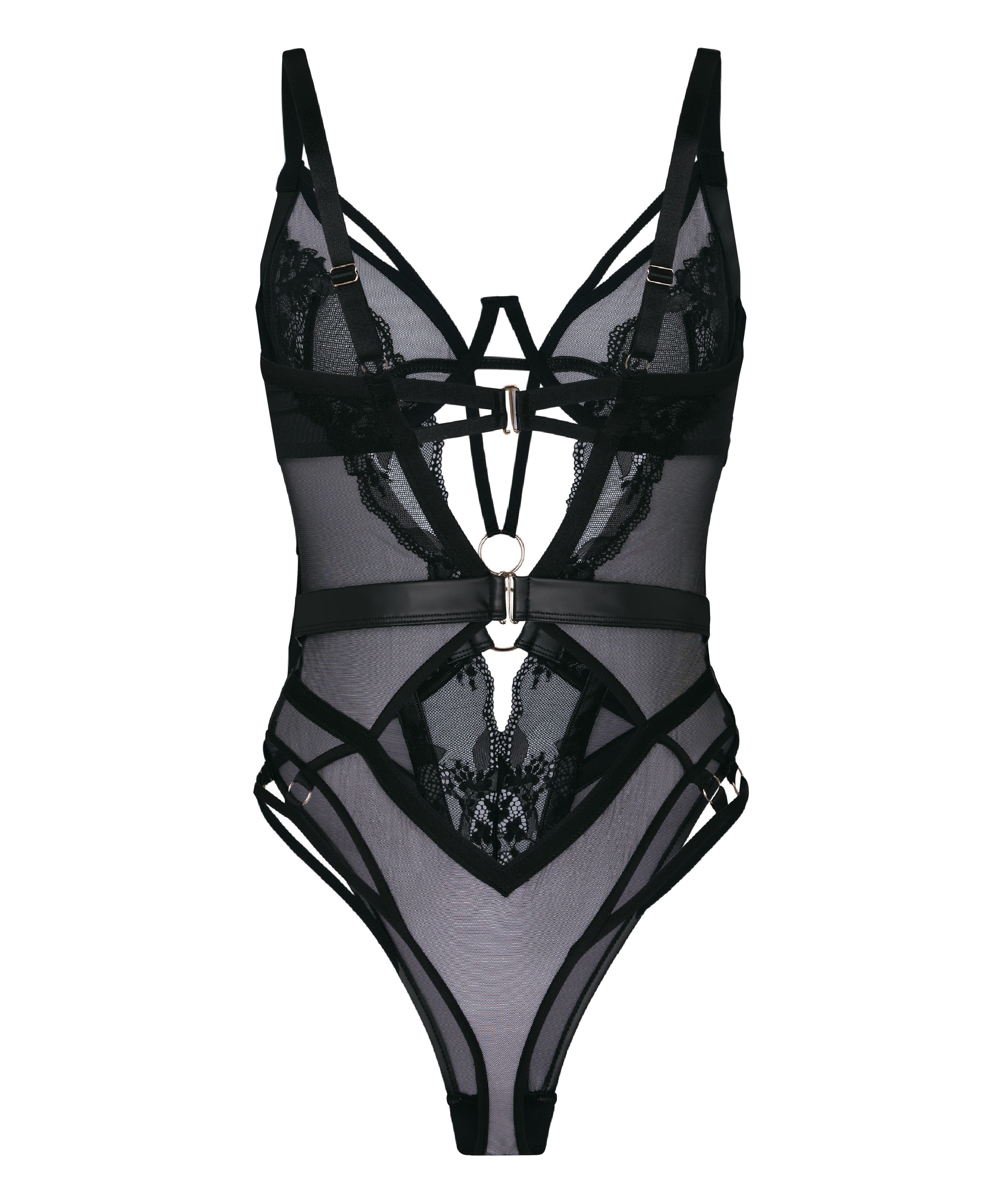 Statement body designed with underwired cups for supportive shaping and structure. Sheer mesh panels are combined with lace and smooth trims to create a striking layered look. Decorative strap details at the front and back add a bold, sculptural effect. Adjustable shoulder straps allow for a personalized fit. Finished with a snap closure at the gusset for practical wear.