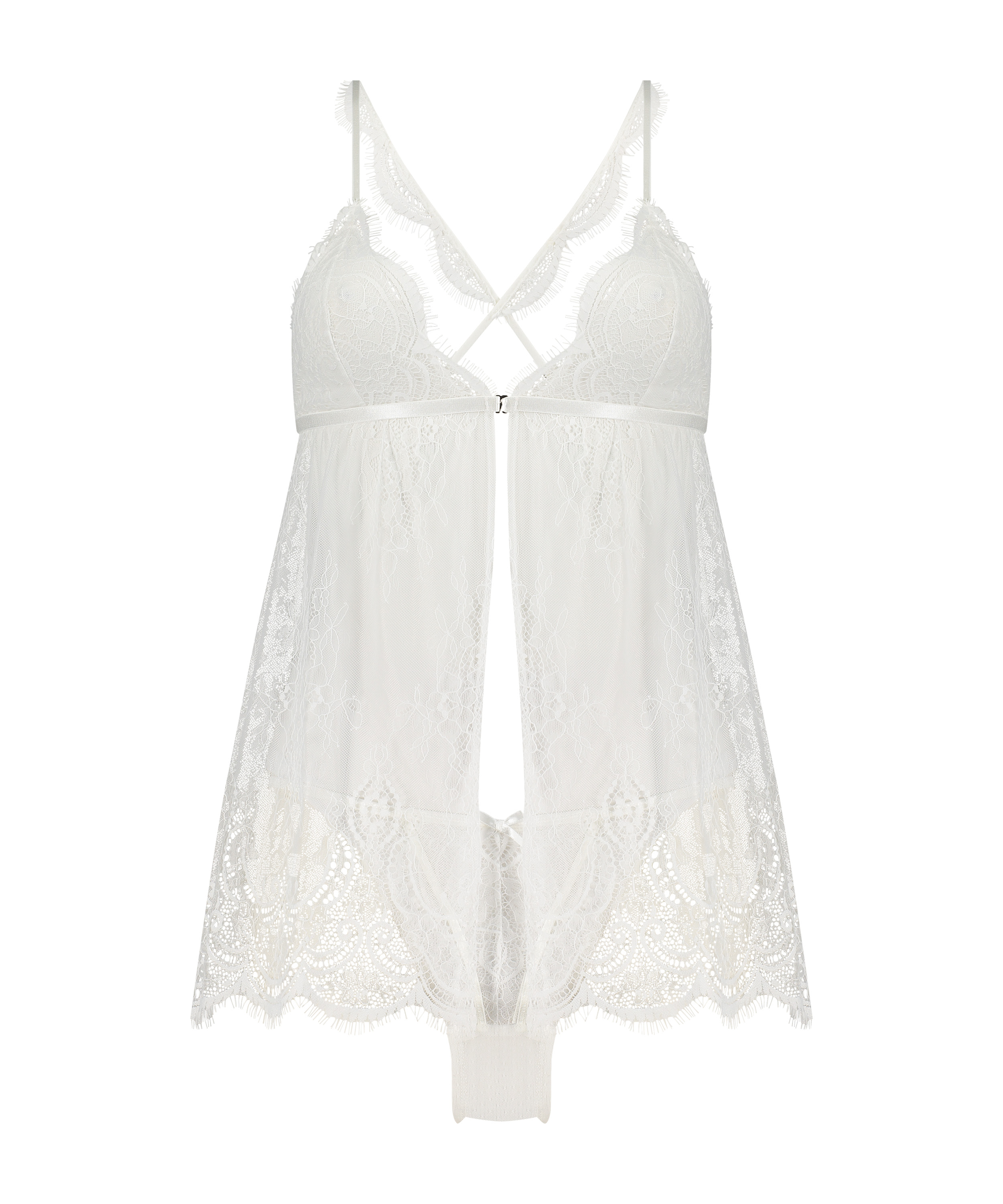 Enjoy the honeymoon phase in this seductive babydoll! Crafted from delicate lace fabric, it features a front clip closure for added convenience. Complete the look with the matching knickers included!