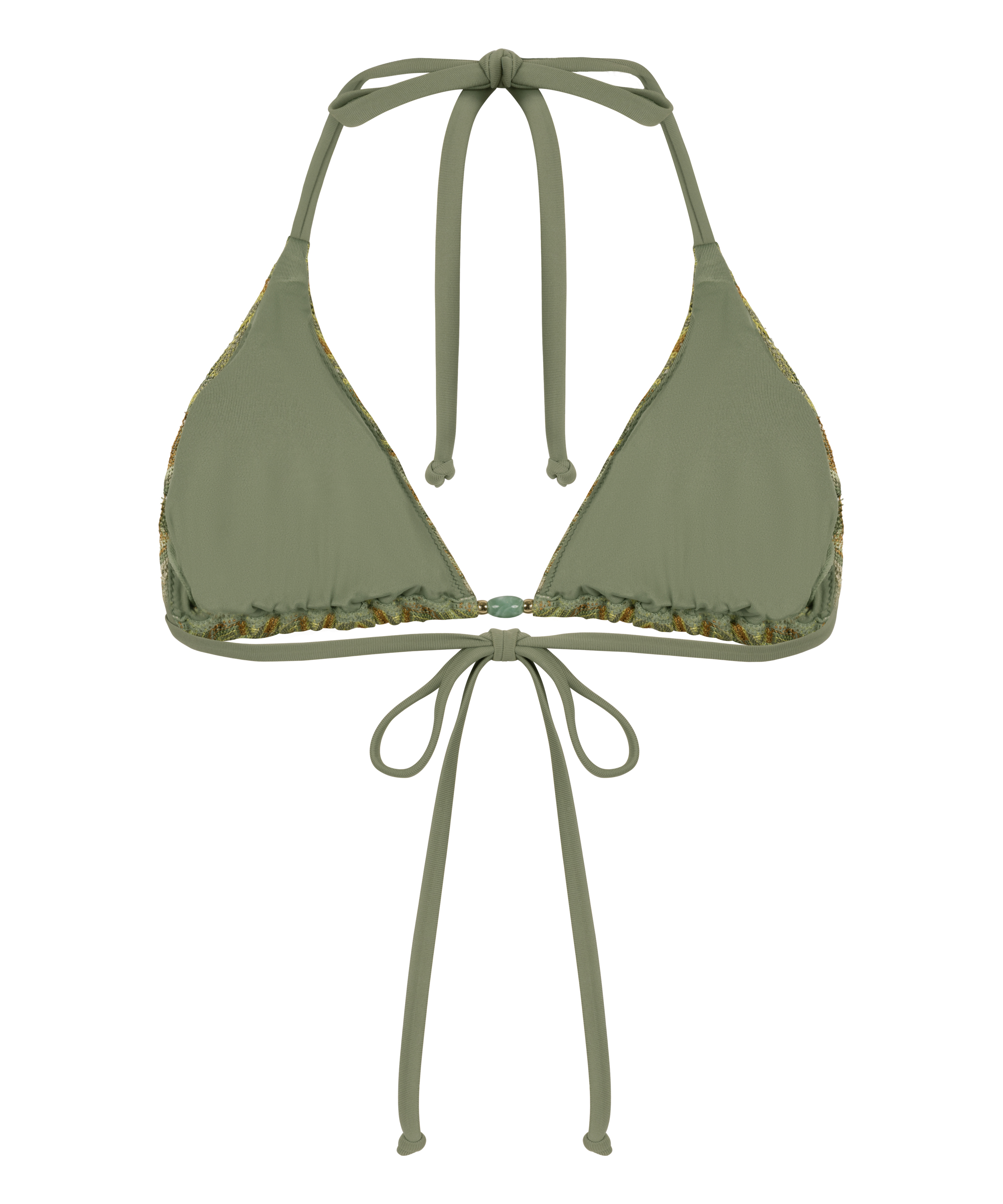 Trun heads at the beach with this bikini top. Designed for a timeless look, this top offers light support and adjusable tie closures for a customizable fit. The triangle cups create a natural shap, while the studs add a stylish touch.Our triangles come fully adjustable with halter tie neck and tie back, to suit your choice of cup coverage. However, if you want fuller coverage, try a size up.