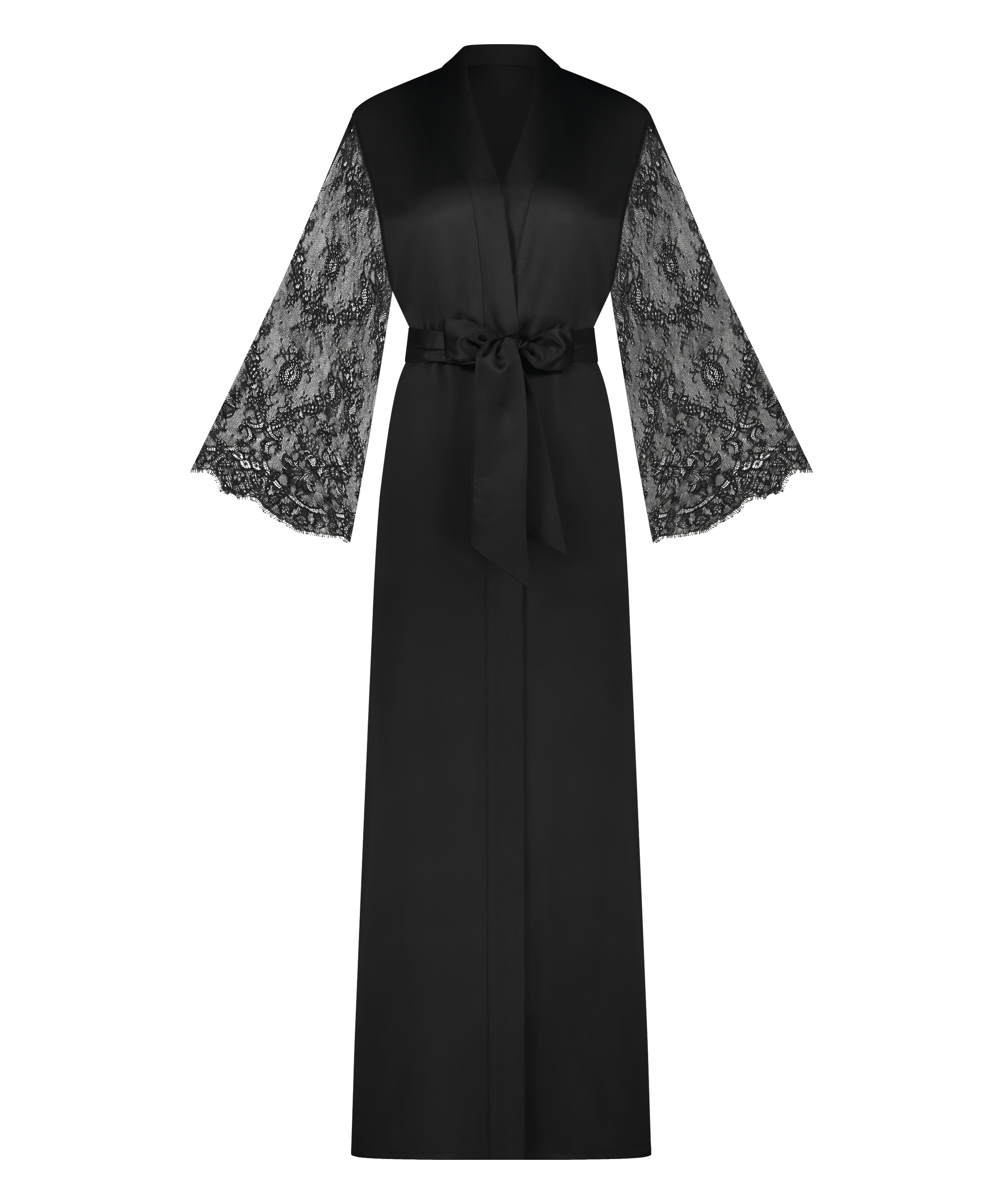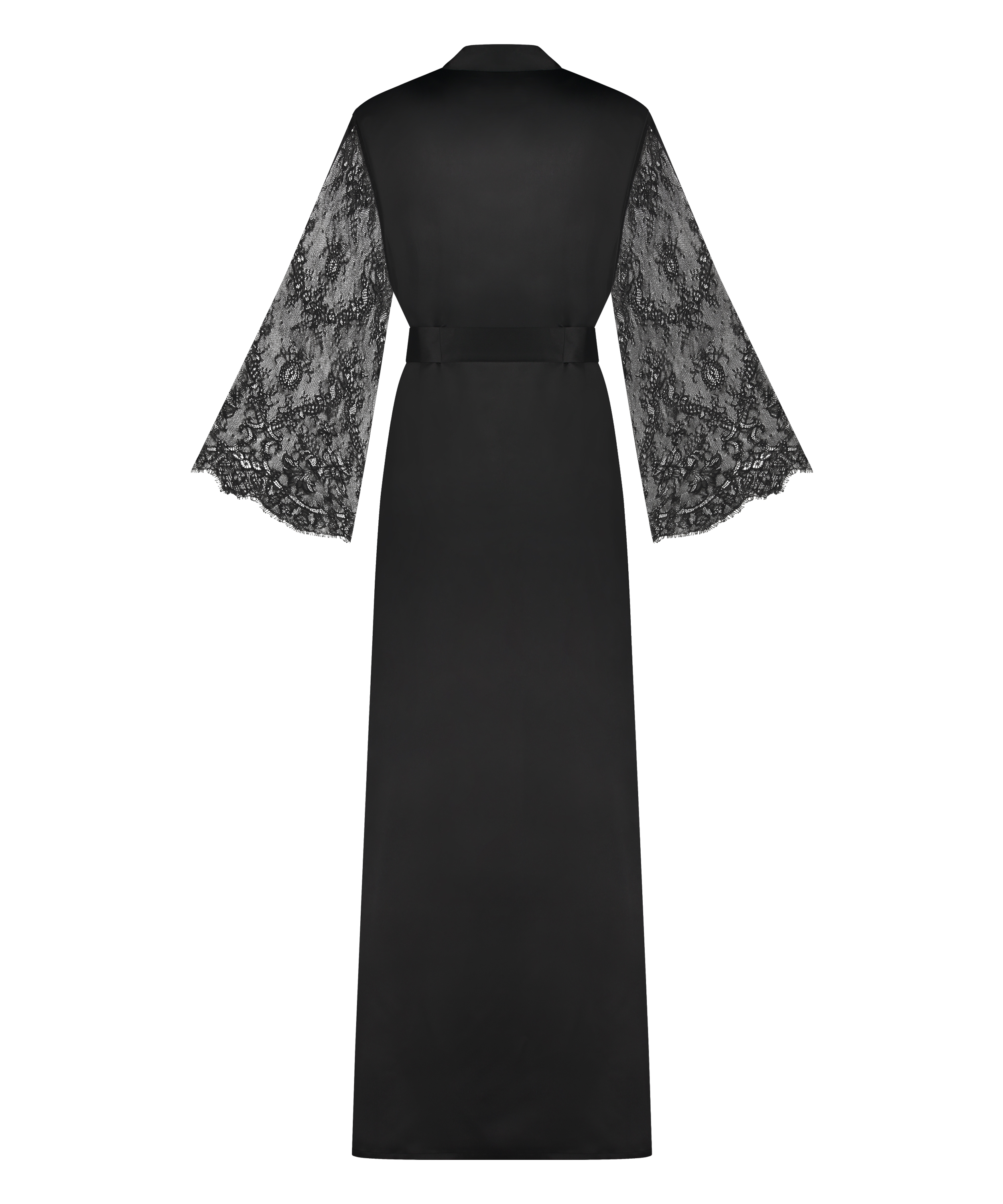 Don't miss this elegant kimono! With lots of romantic lace and a real tie closure. This adorable kimono has wide sleeves and is made of satin material what gives it a luxurious look. Combine with matching items. Part of our Noir collection.