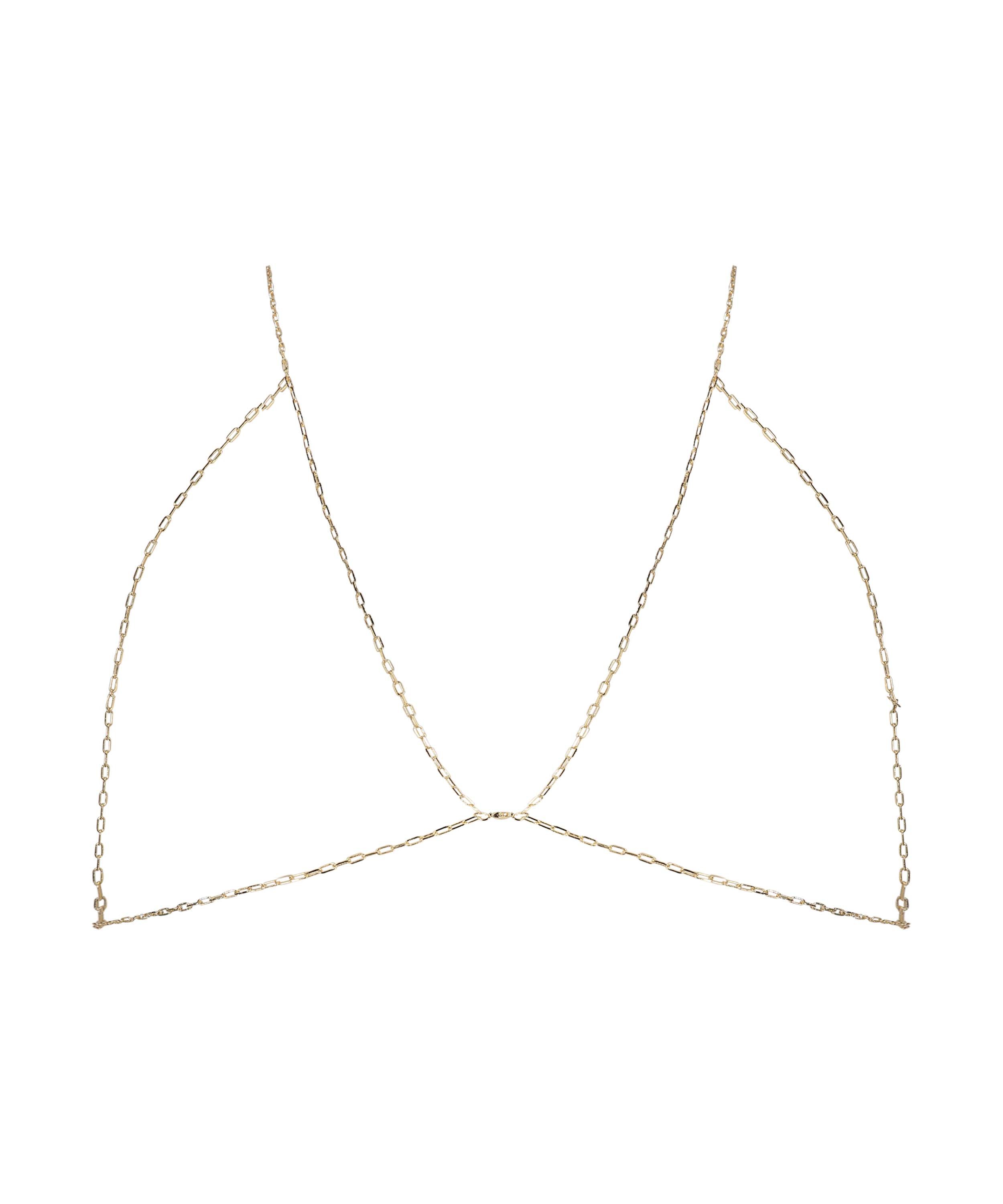 Style your outfit with this super-pretty chain bralette! It is gold-coloured. Match with a fun outfit or lingerie set!