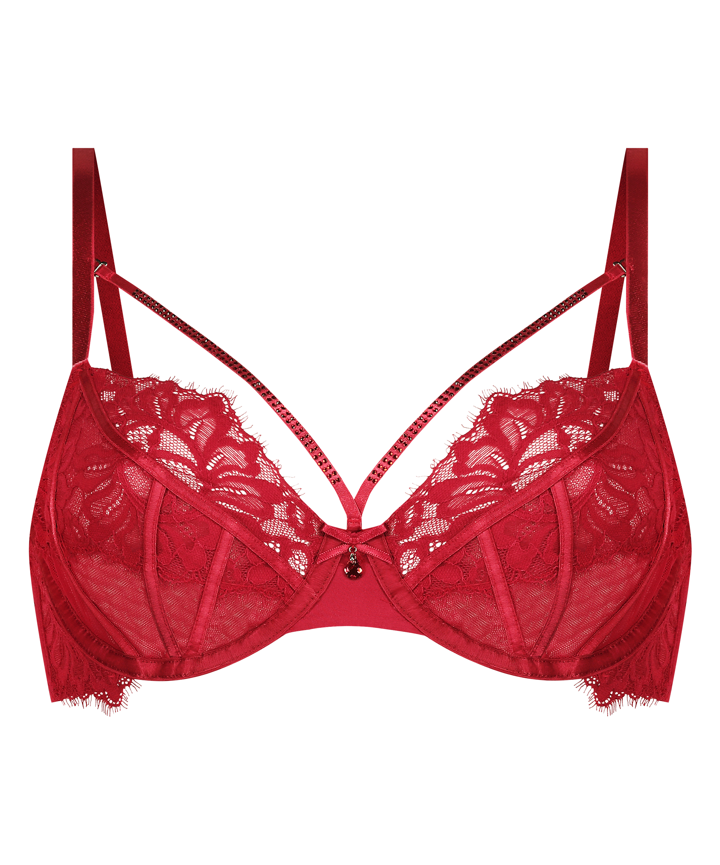 This unpadded bra features a removable strappy necklace adorned with rhinestones, adding a touch of glamour. The cups are embellished with lace and feature a sparkling jewel and a bow in the centre for an extra touch of elegance.
