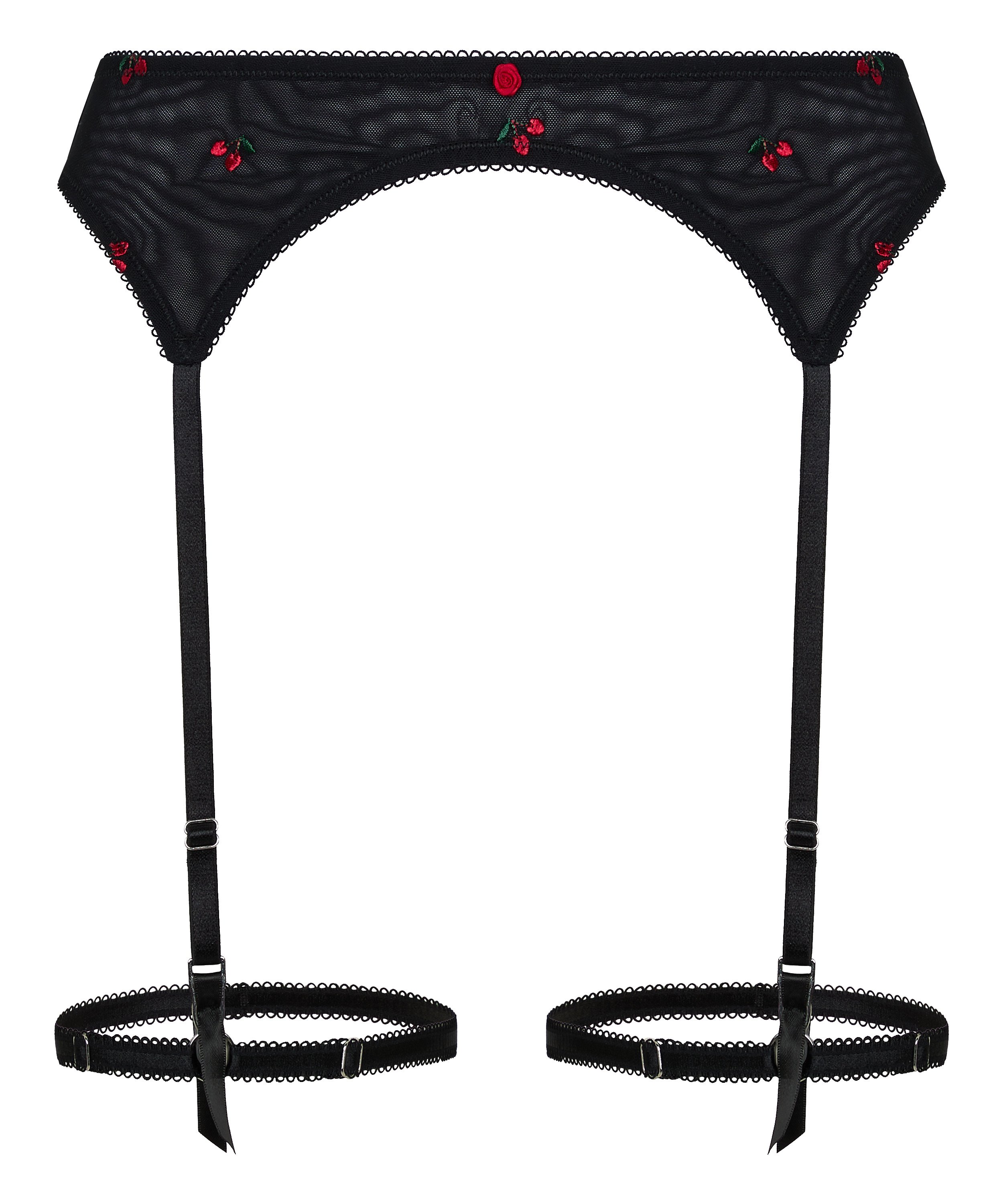 Sweet meets seductive with this playful suspender belt, crafted from sheer mesh for a flirty finish. Adorned with delicate cherry embroideries, it adds a fun and feminine touch to your lingerie look. Adjustable straps ensure a perfect fit while soft satin trims elevate the design. Ideal for pairing with matching bra and Brazilian for a coordinated ensemble.