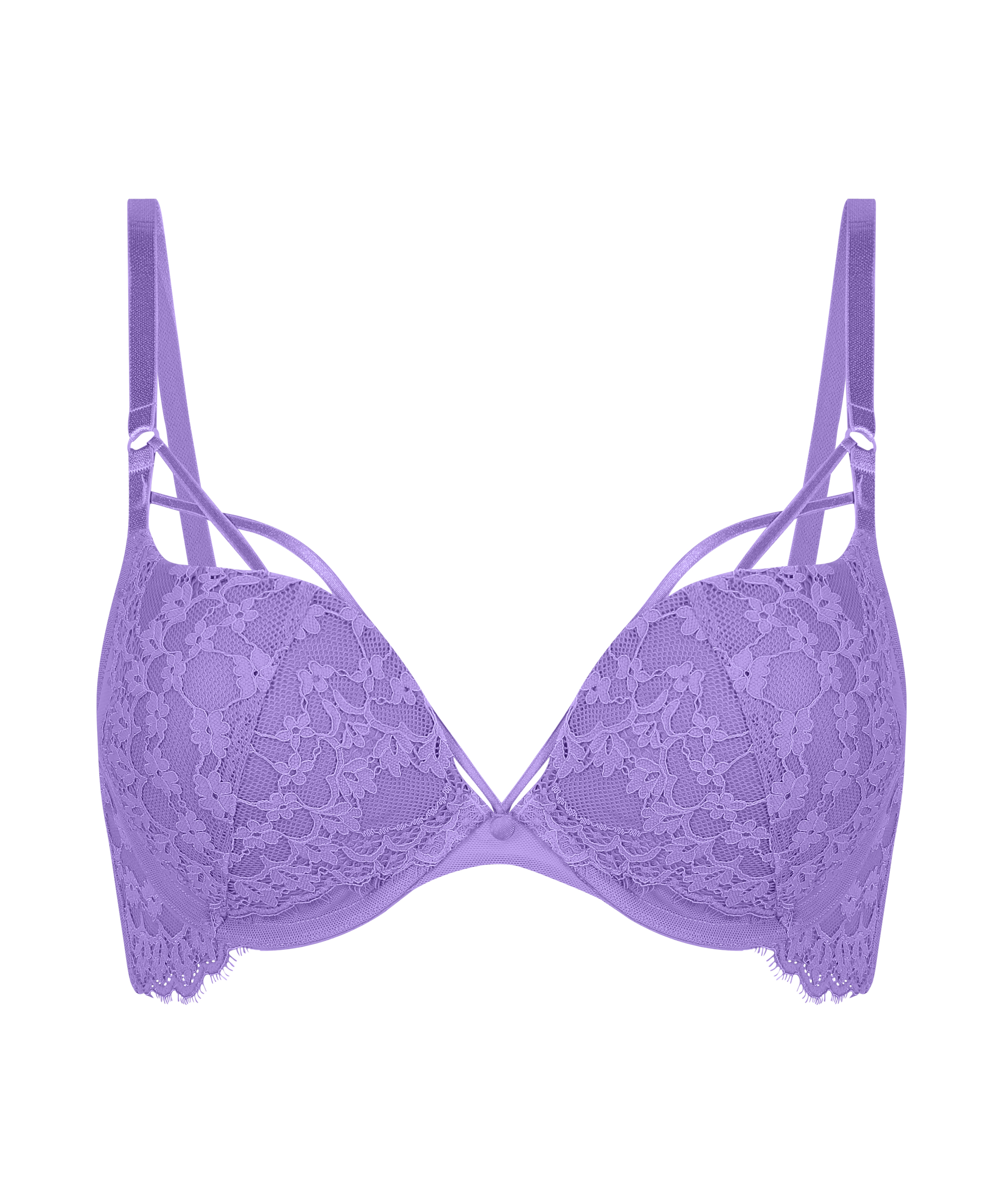 This comfortable maximizer bra is your new best friend! With fun strappy details over the breasts, paired with underwired cups for a comfortable fit. It is finished off with romantic lace details. Pair with the matching knickers!