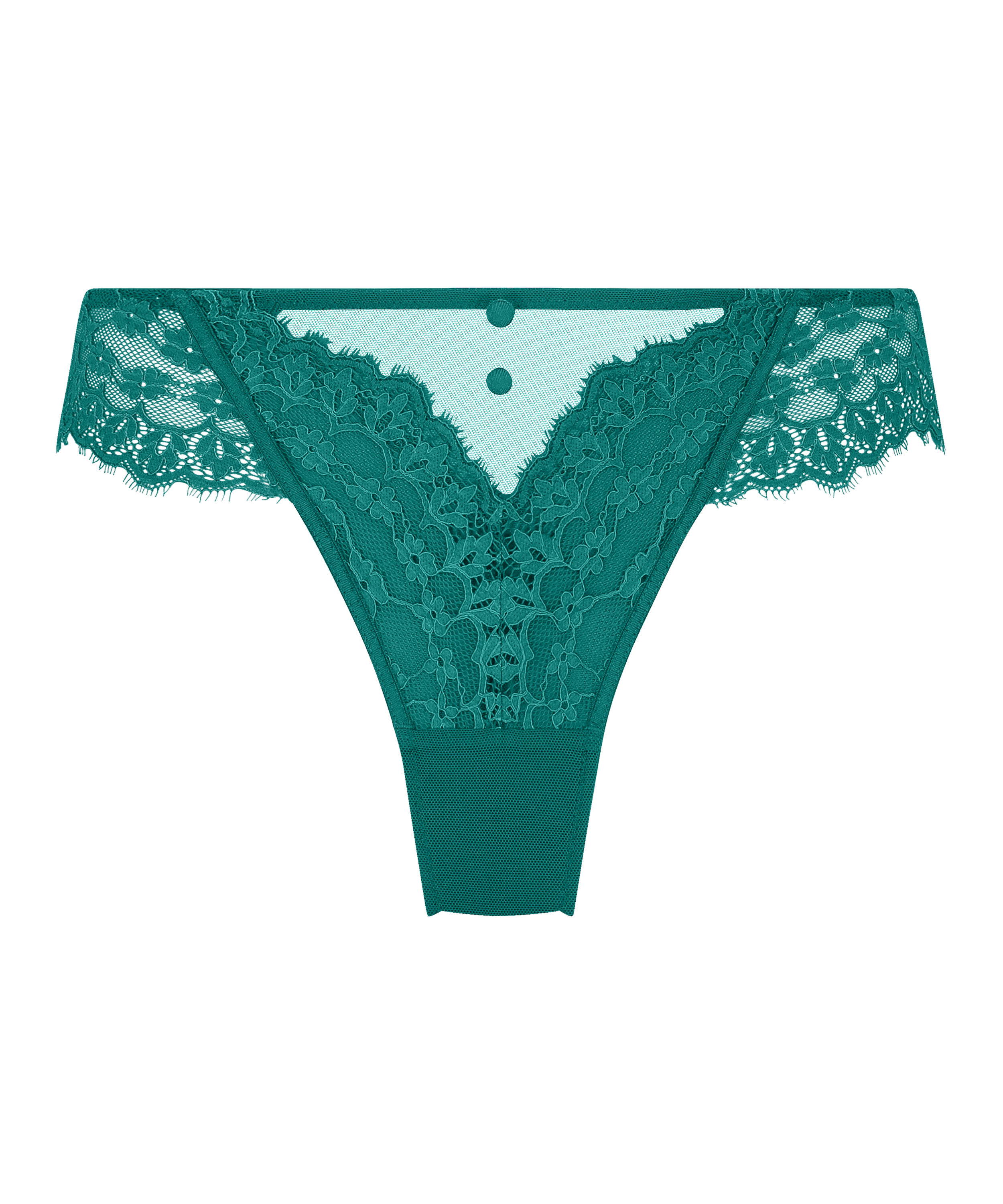 This trendy thong features a transparent lace front and a mesh back. A small button in the middle of the front adds a finishing touch.