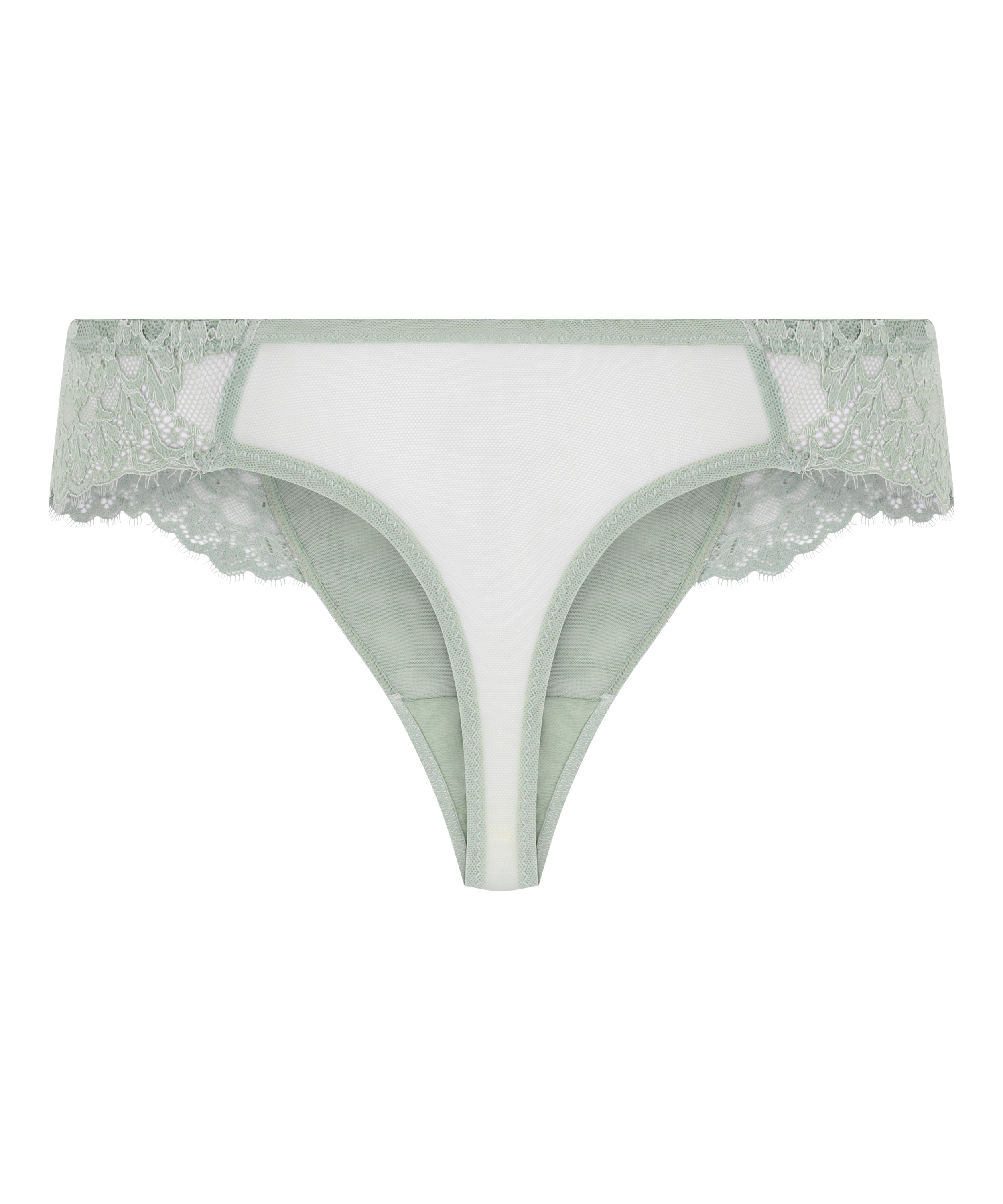 This trendy thong features a transparent lace front and a mesh back. A small button in the middle of the front adds a finishing touch.
