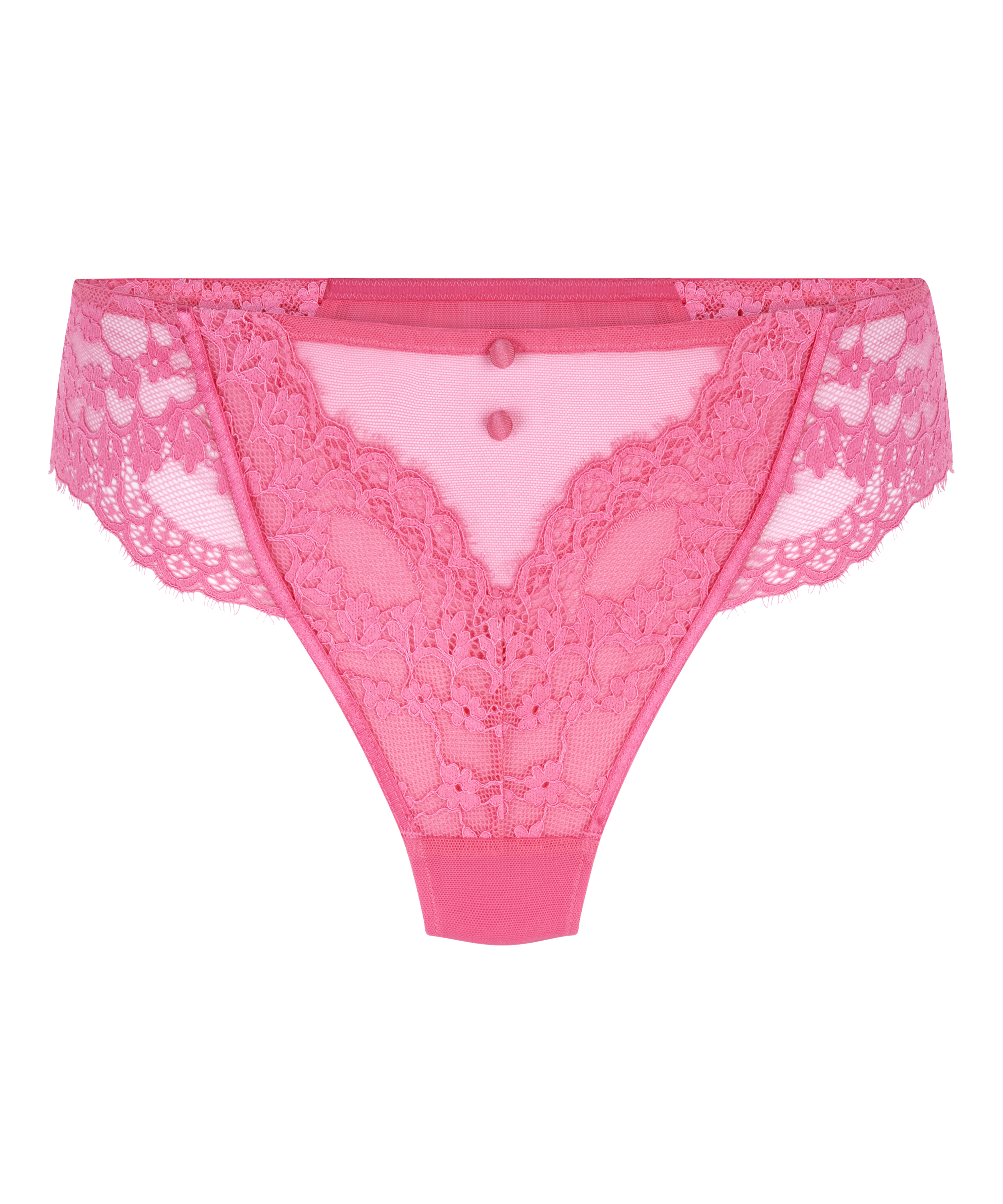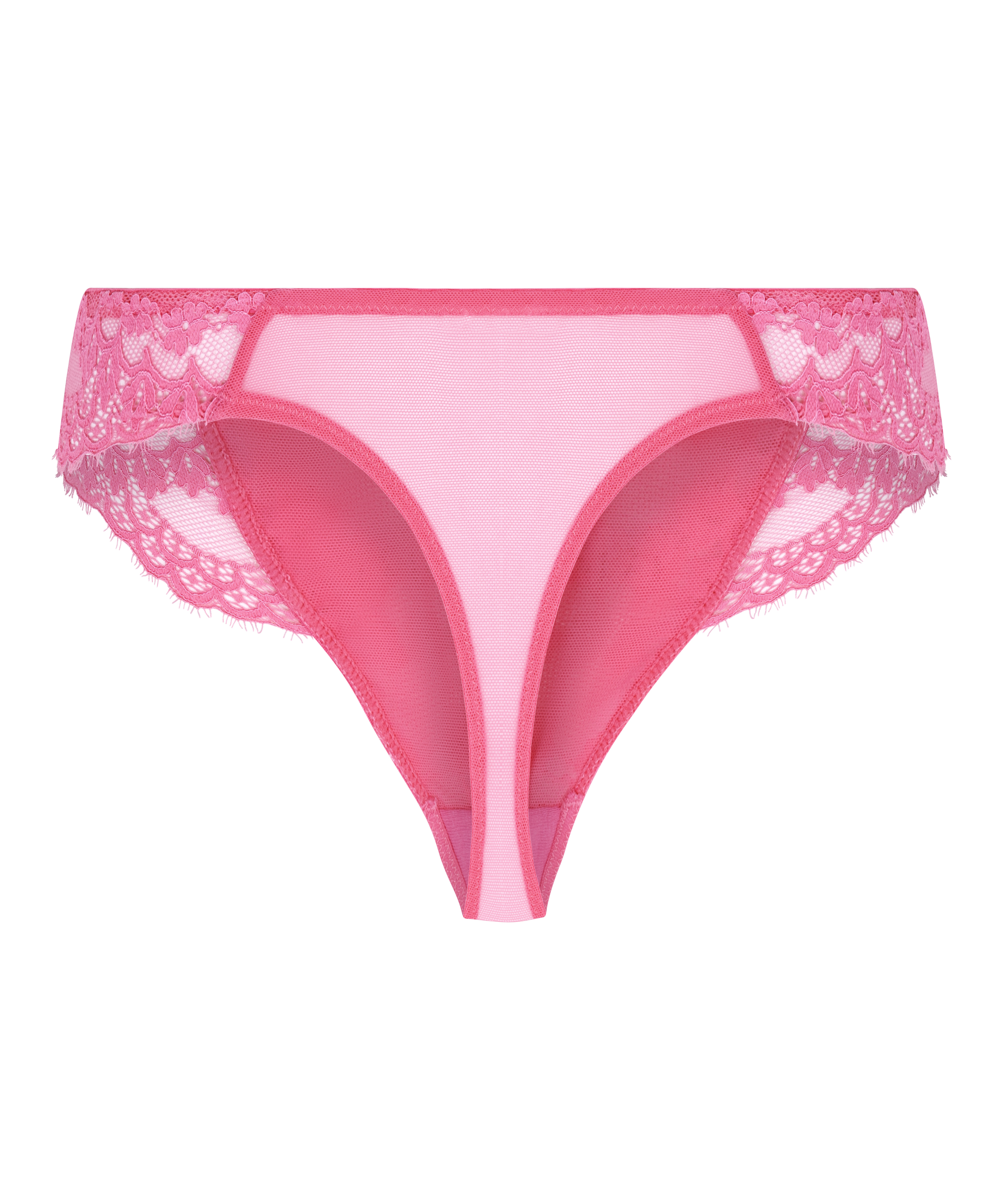 This trendy thong features a transparent lace front and a mesh back. A small button in the middle of the front adds a finishing touch.