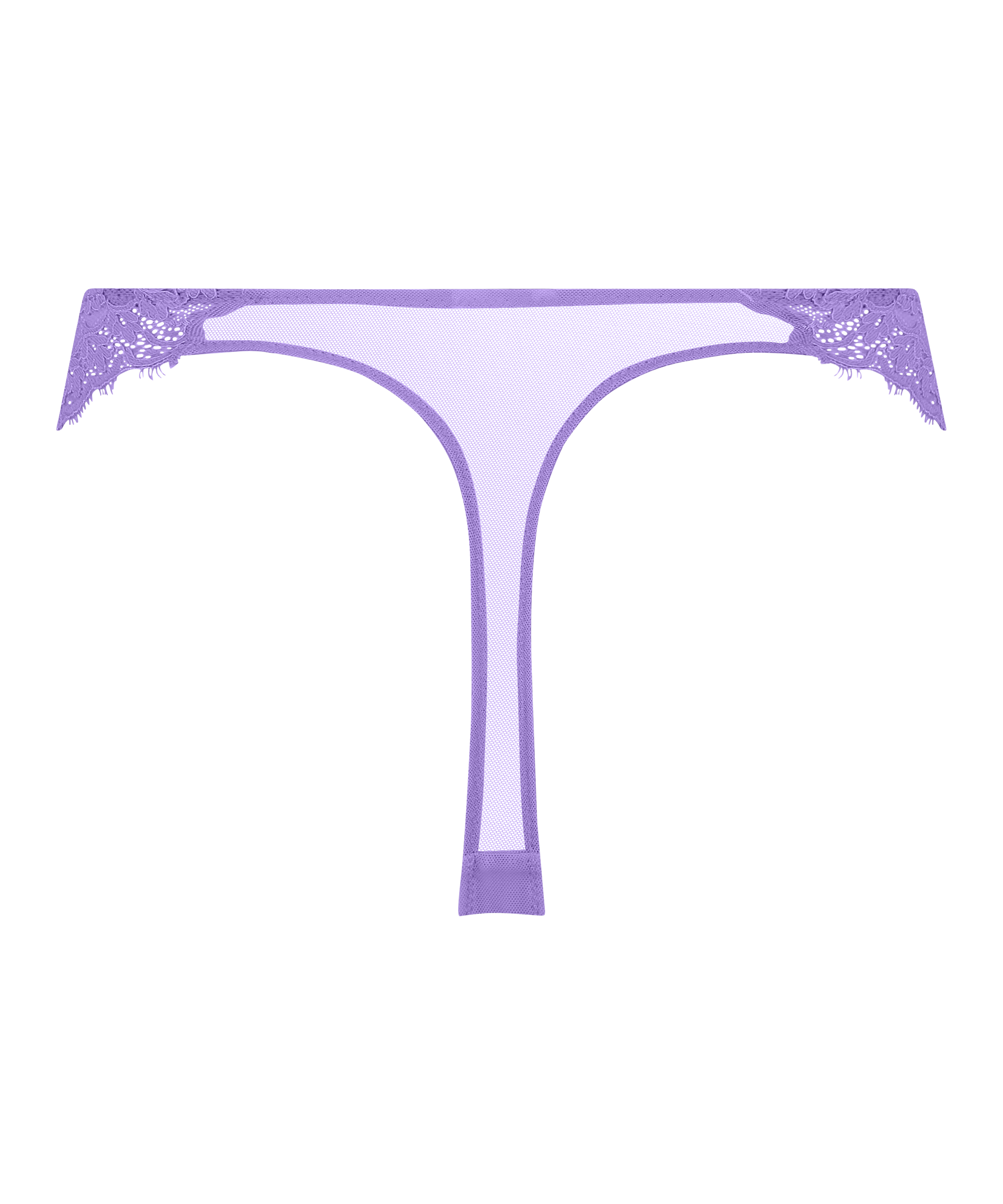 This trendy thong features a transparent lace front and a mesh back. A small button in the middle of the front adds a finishing touch.