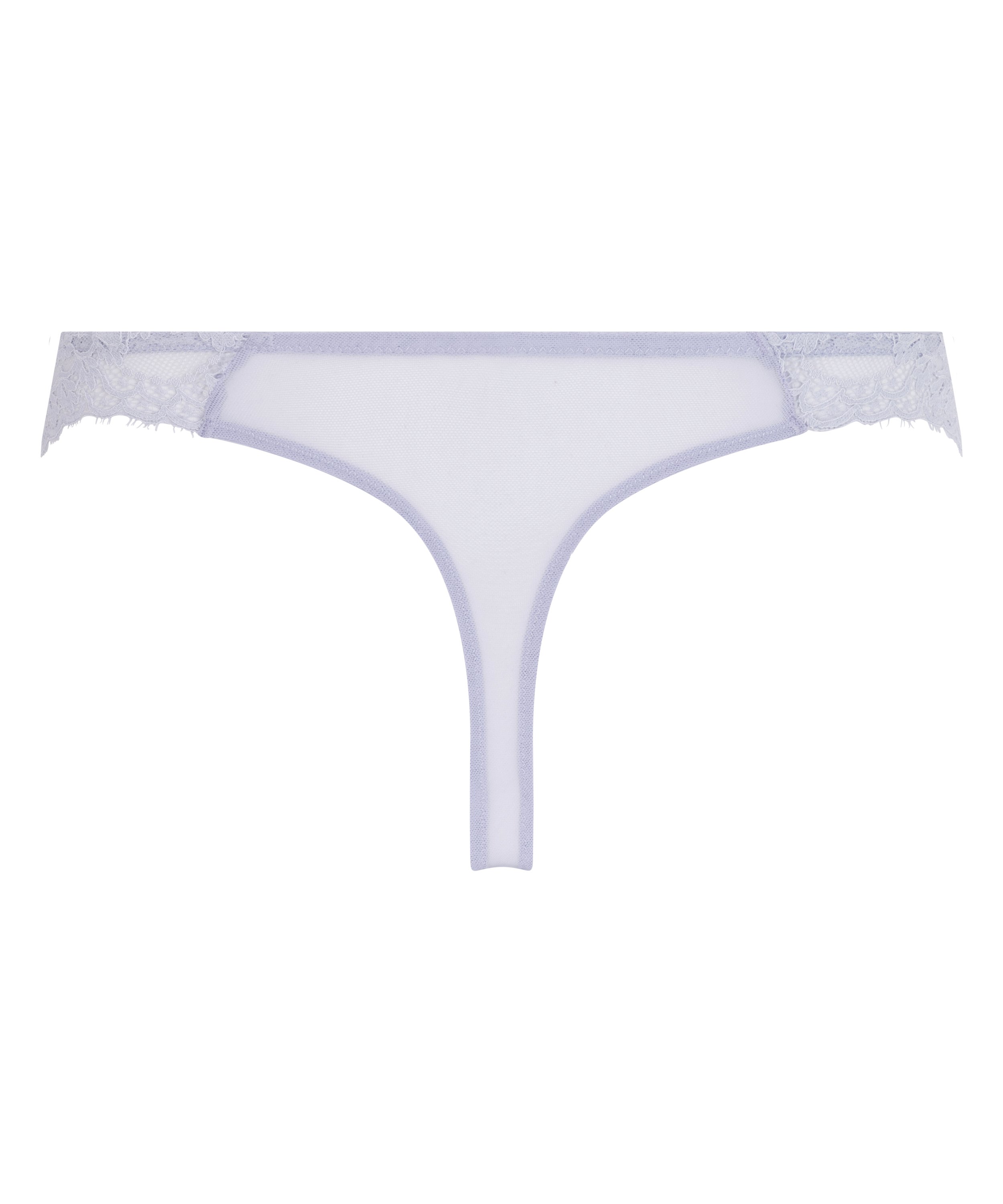 This trendy thong features a transparent lace front and a mesh back. A small button in the middle of the front adds a finishing touch.