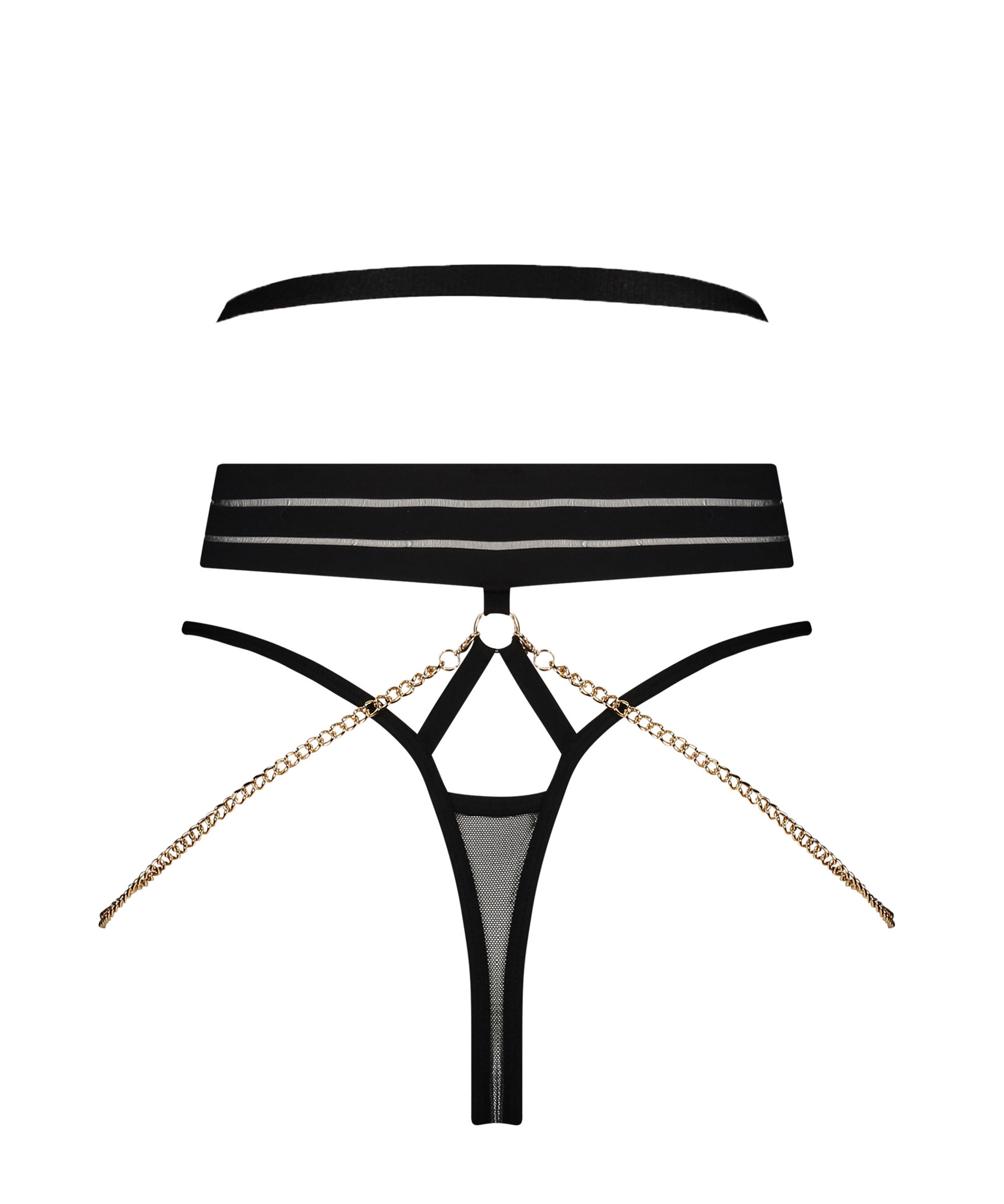Spice things up with this thong! With lots of strappy and cut-out details for a spicy look. The front is decorated with faux leather and includes lots of golden details. Part of our Private collection.
