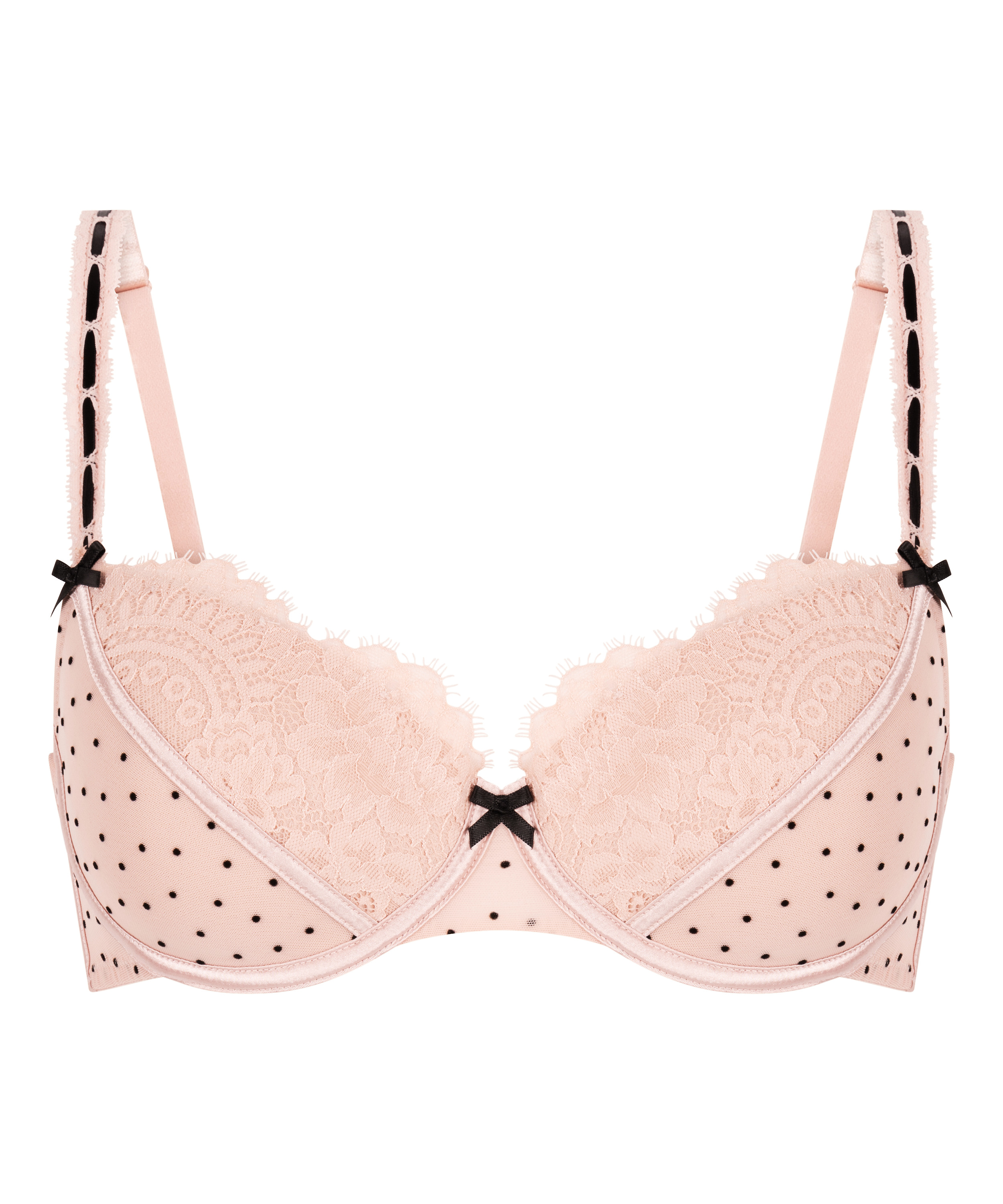 Add a touch of charm to your lingerie collection with our Dorothy bra. Designed with soft padding and supportive underwire, it offers a flattering lift and all day comfort. The cups feature a mix of dotted mesh and lace details. Finished with bows at the straps and center front. Combine with the matching bottom for a complete look.