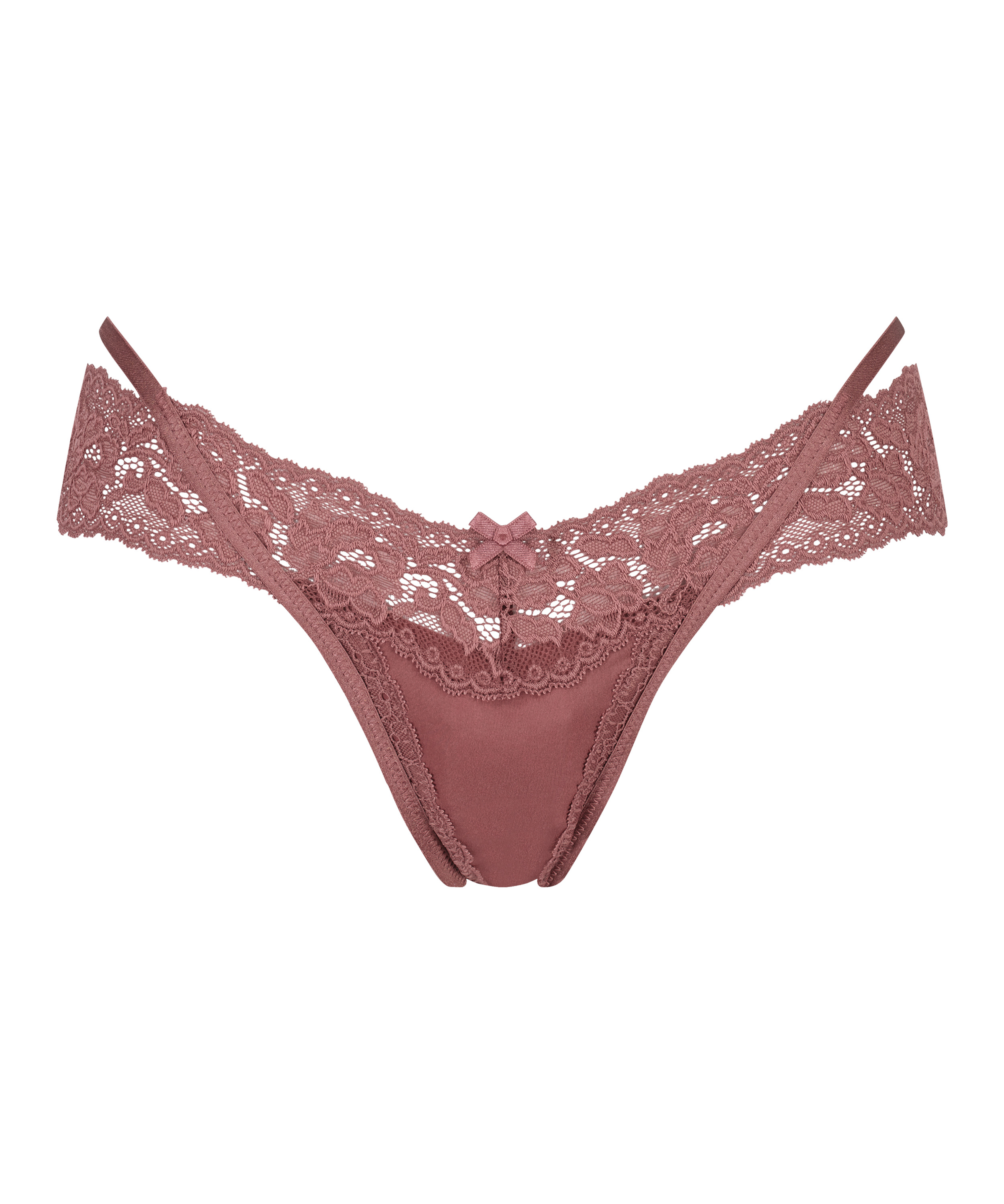 This extra low V thong has an extra fun twist! With strappy detailing and oodles of lace. Combine with a matching bralette or bra for a complete set.