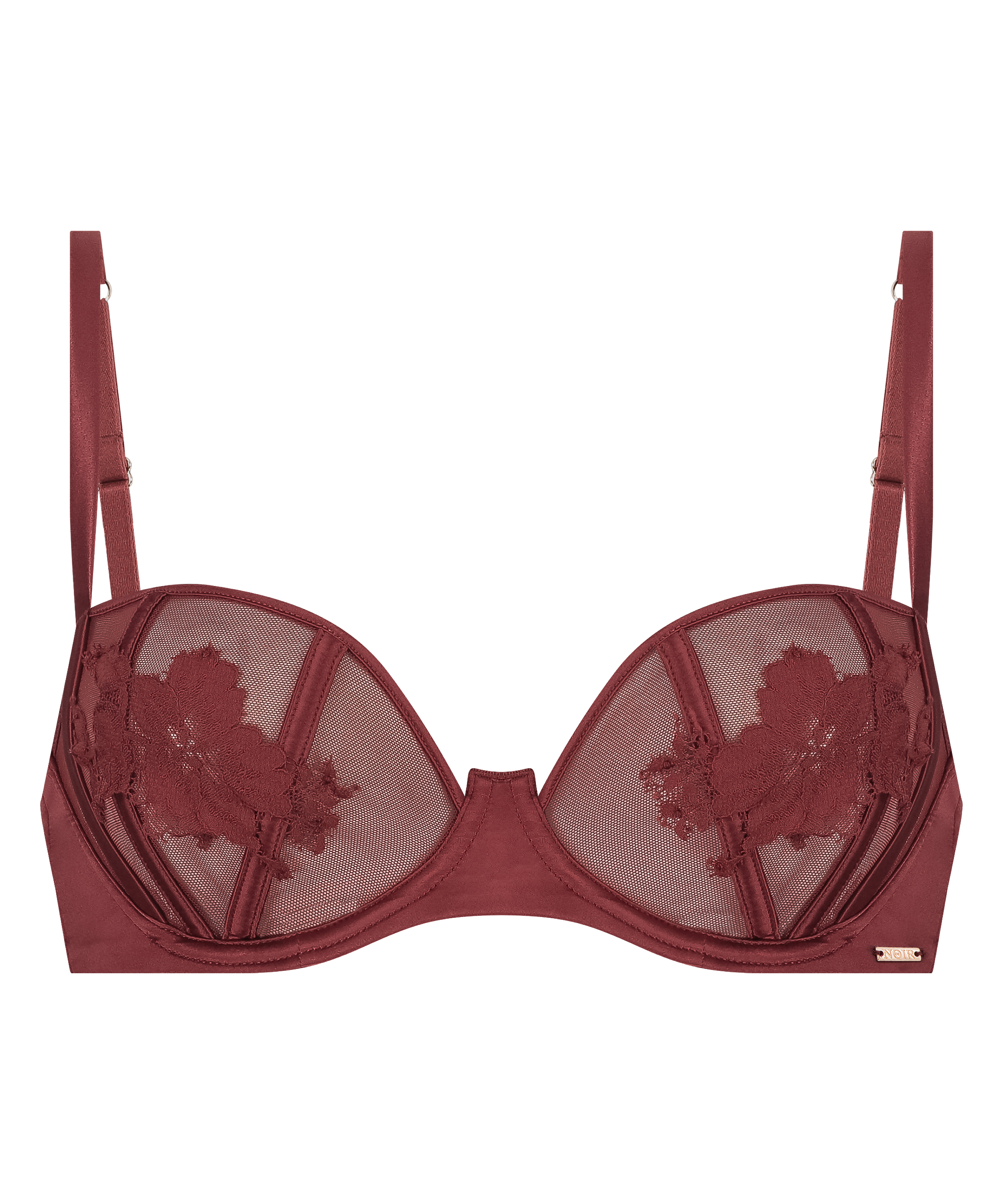The Ember bra is a stunning blend of subtlety and sophistication. This chic balconette design is decorated with a delicate embroidery and a beautiful sheer fabric. Elevate your lingerie collection with this masterpiece and pair with the matching Ember brief or thong for a seamlessly captivating look! Part of the Noir collection.
