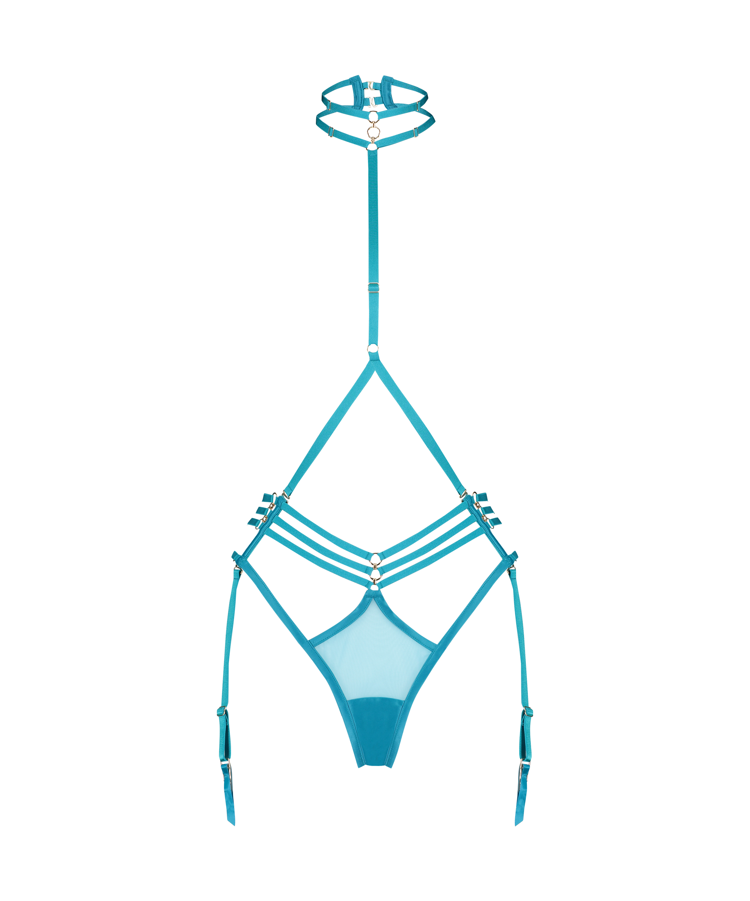 Indulge in the ultimate allure with our Eros Thong! The thong itself is crafted with captivating strappy details interconnected with sleek rings. Designed for maximum versatility, it features removable suspender straps and a detachable strappy body necklace, allowing you to customize your look effortlessly. Crafted with delicate mesh for an added touch of allure, this thong is undeniably sexy. Pair it with the Eros bralette and hosiery to create a seductive ensemble that will leave a lasting impression!