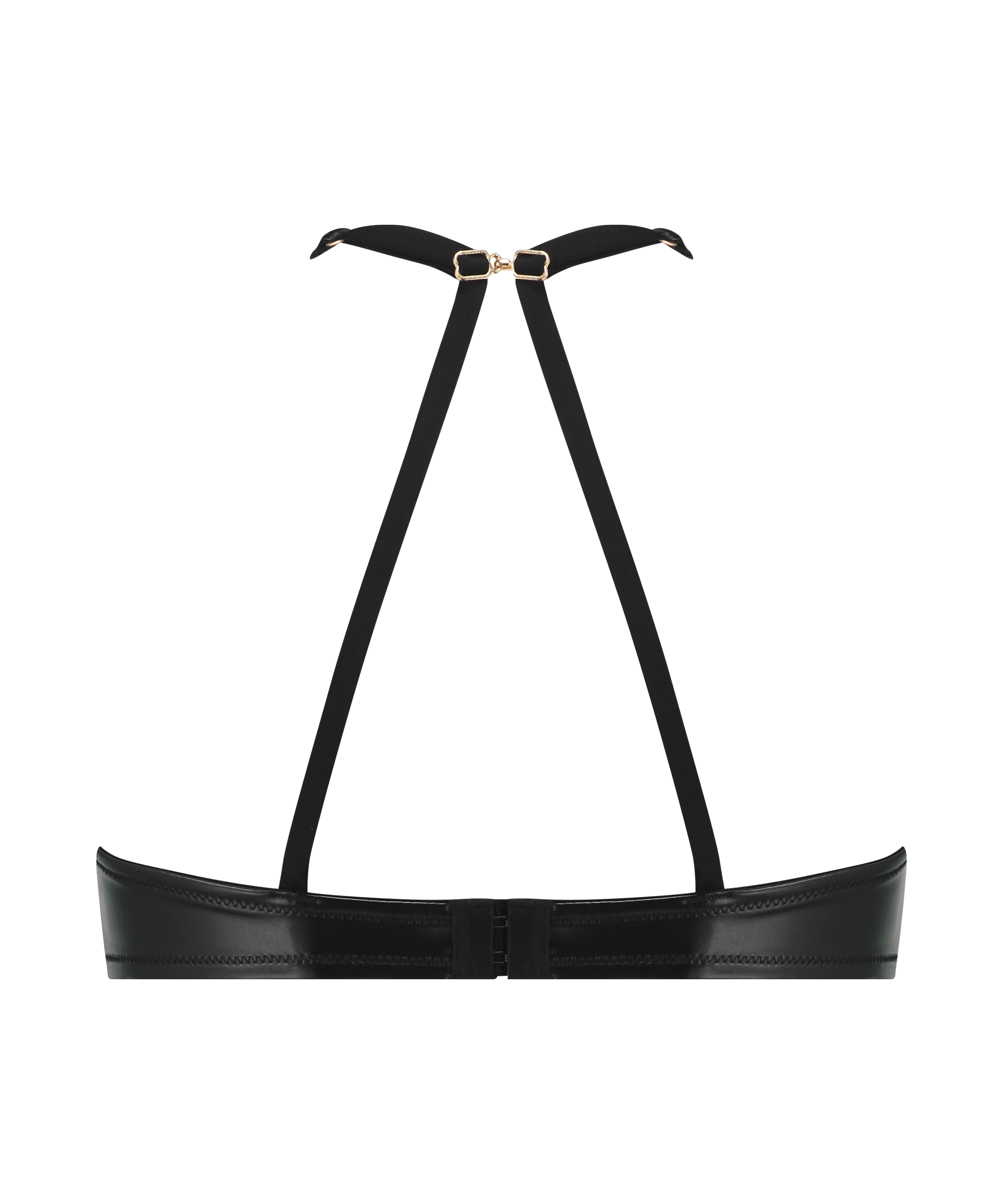 This bra features a sleek black faux leather design with delicate gold hardware. The plunging neckline offers a daring touch, while the adjustable straps ensure a customized fit. The underwire cups provide support and shape. The bra is designed to flatter your figure and offer a glamorous look.
