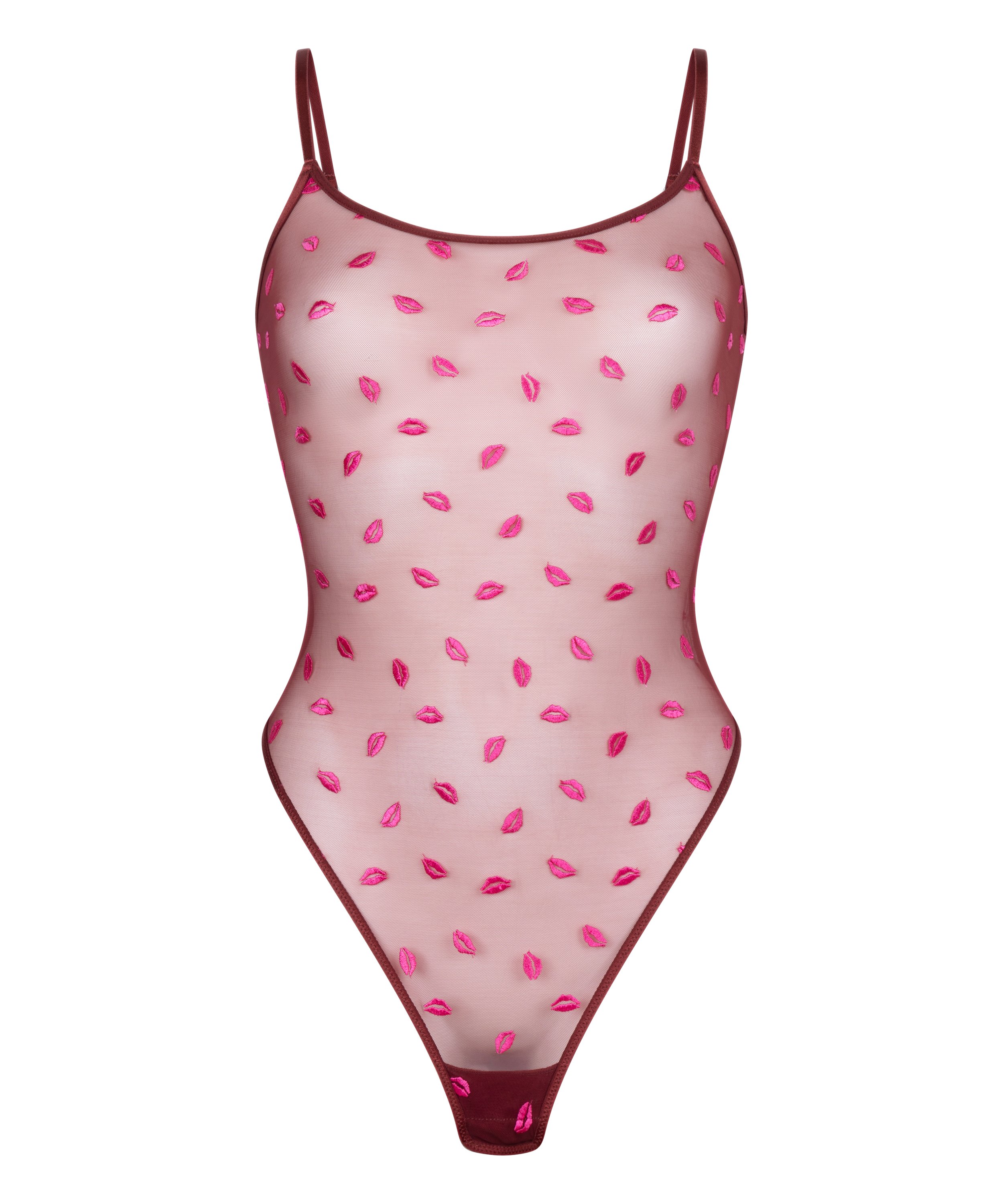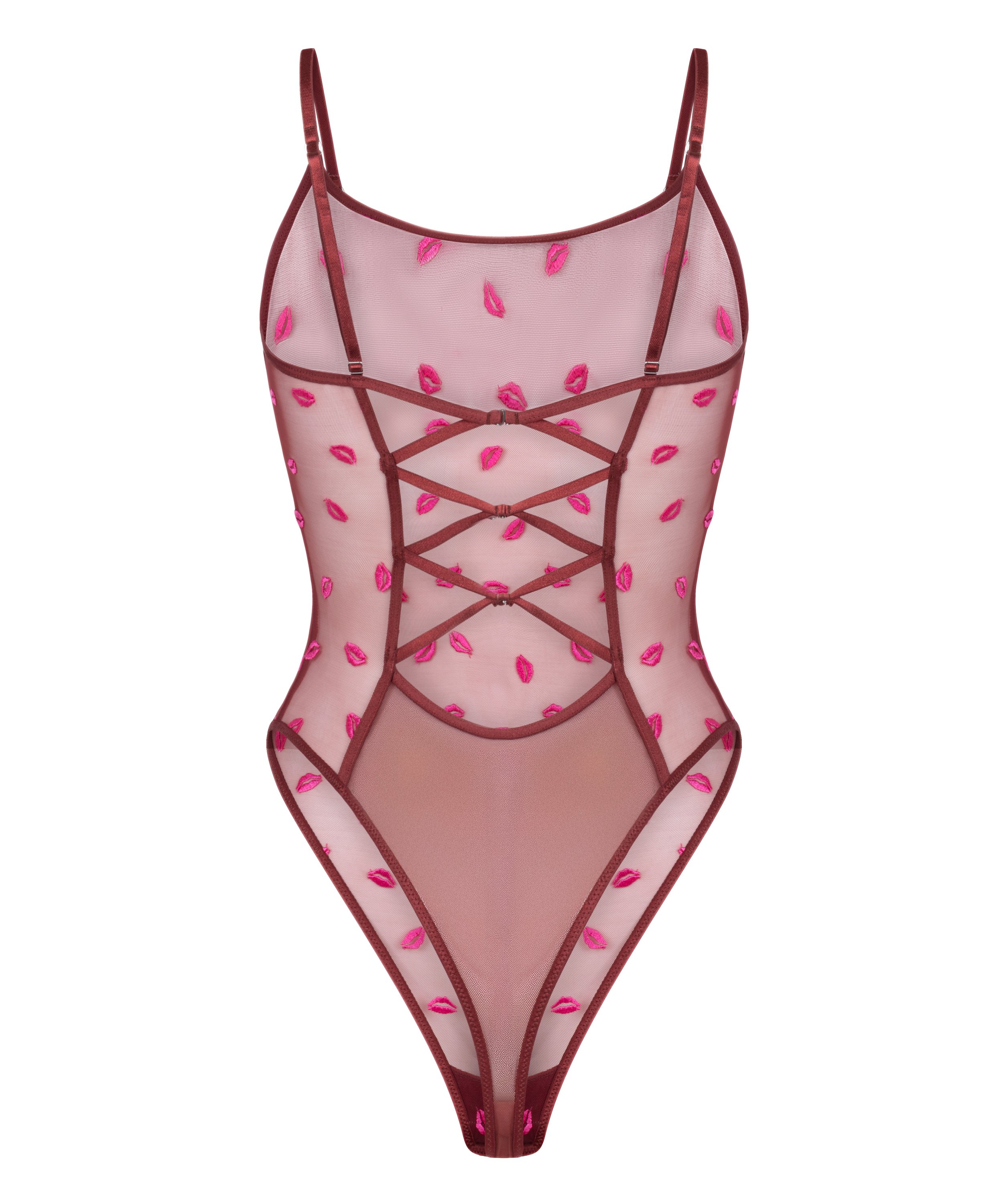 Be irresistible with this sheer mesh body, designed for a bold yet romantic look. Featuring an open back with crisscross string details, it creates a striking silhouette. Adorned with playful kiss embroideries, this piece blends flirty elegance with modern trend. Add it to your wardrobe and elevate your outfits!