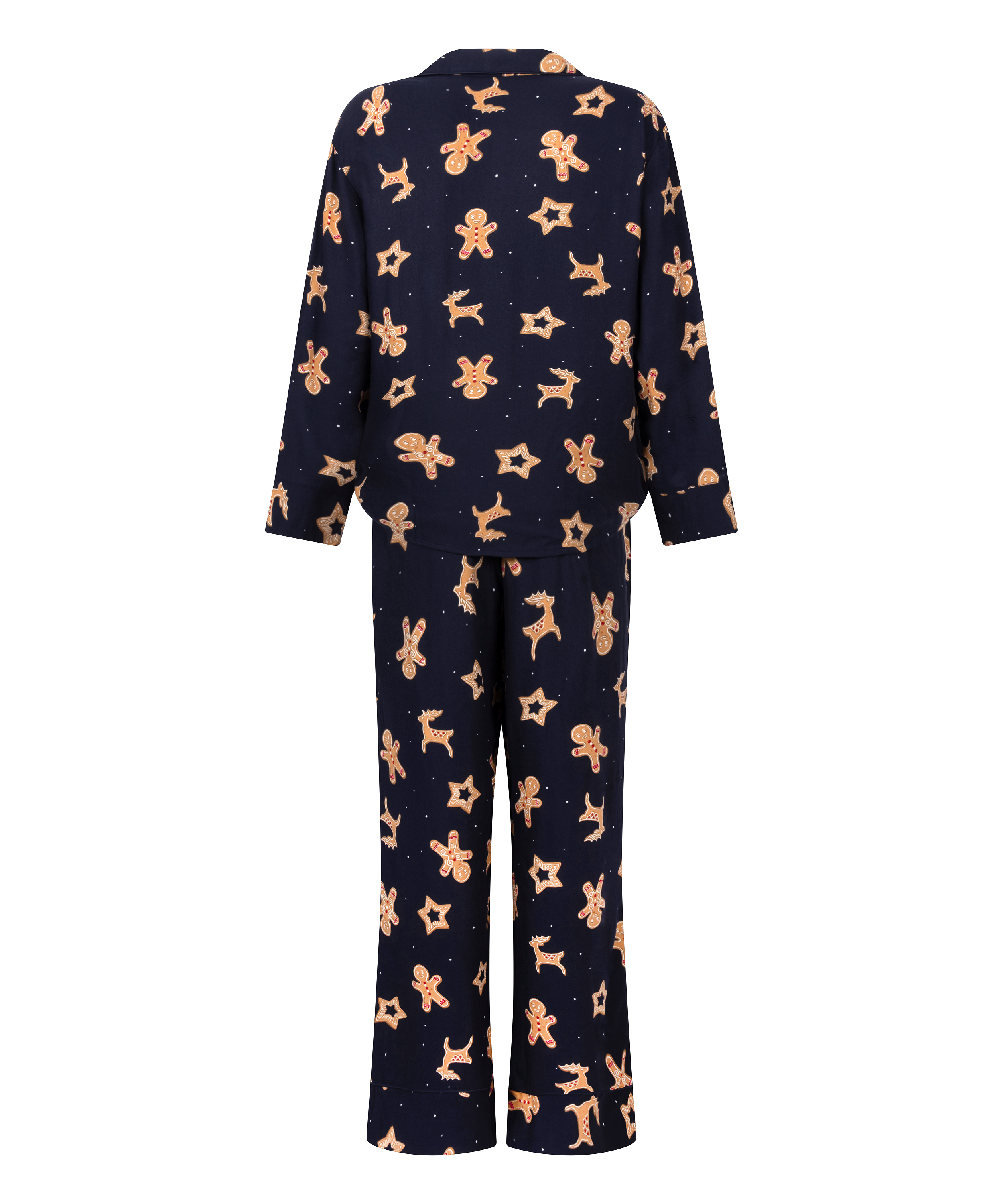 Sweet dreams, gingerbread style. This festive twill pyjama set is your go-to for cozy nights and cute holiday vibes, featuring a playful gingerbread cookie print that’s almost too sweet to sleep in. The long-sleeved V-neck top and wide-leg trousers with an elasticated waist are made for lounging in comfort and style.