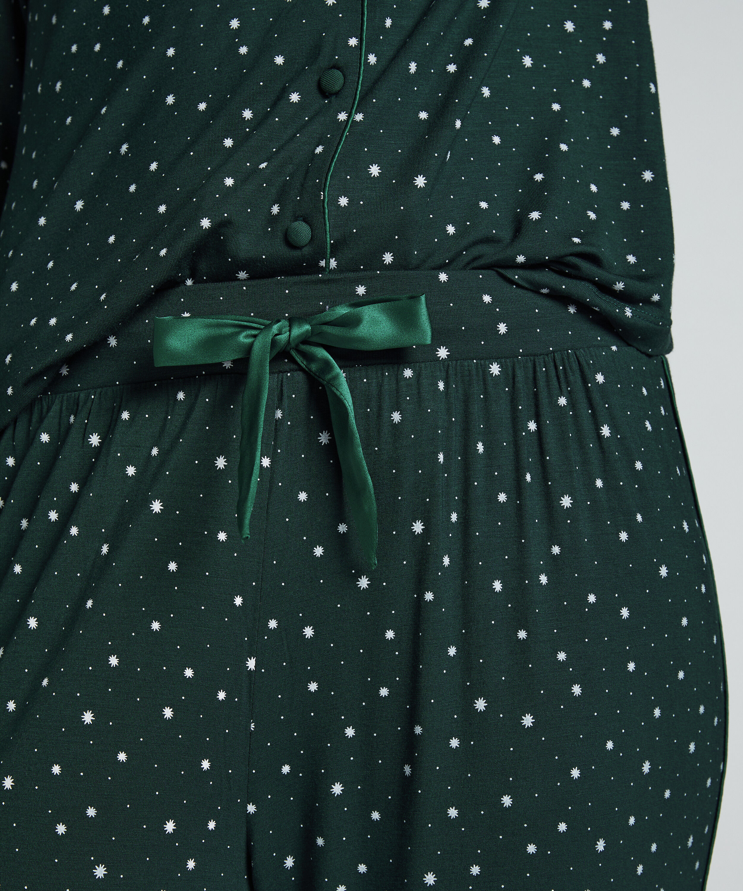 Sweet dreams, gingerbread style. This festive twill pyjama set is your go-to for cozy nights and cute holiday vibes, featuring a playful gingerbread cookie print that’s almost too sweet to sleep in. The long-sleeved V-neck top and wide-leg trousers with an elasticated waist are made for lounging in comfort and style.