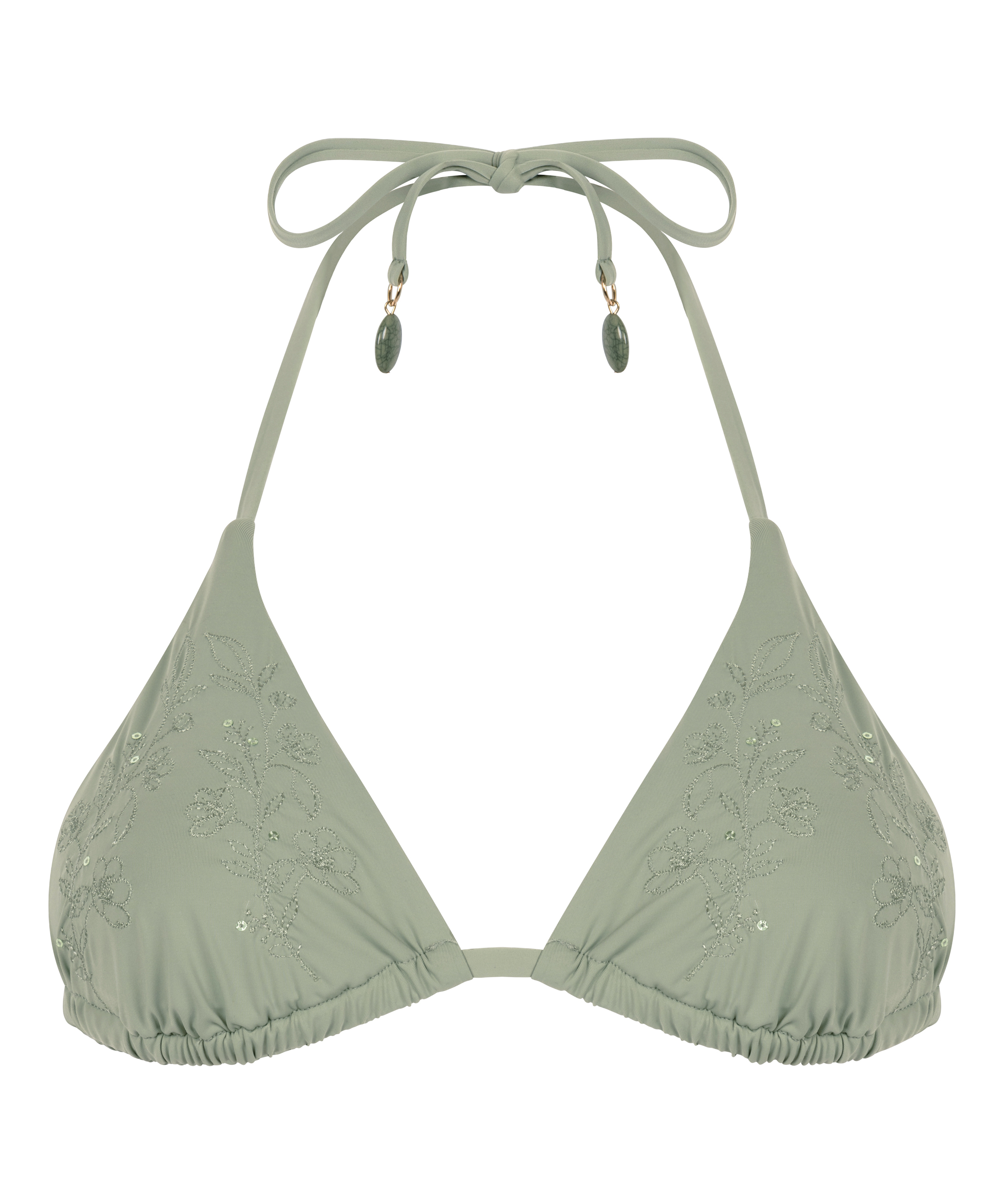 Elevate your swimwear with this delicate triangle top, designed for a flattering and effortless fit. The shimmering flower detail adds a touch of elegance, catching the light beautifully. Pair it with matching bottoms for a coordinated and eye-catching beach look!Our triangles come fully adjustable with halter tie neck and tie back, to suit your choice of cup coverage. However, if you want fuller coverage, try a size up.