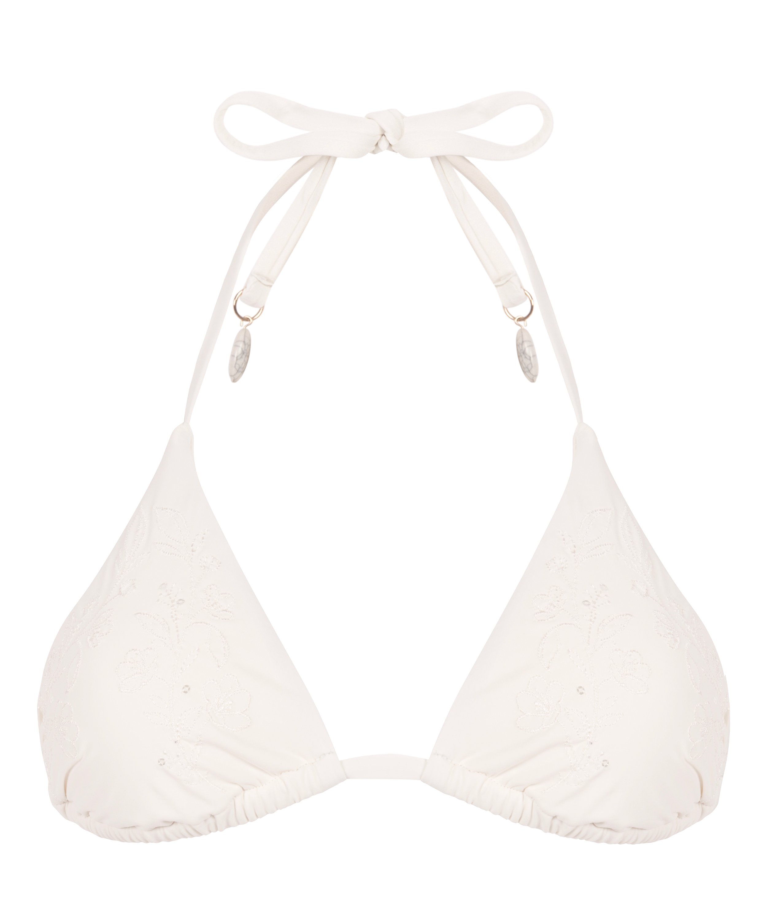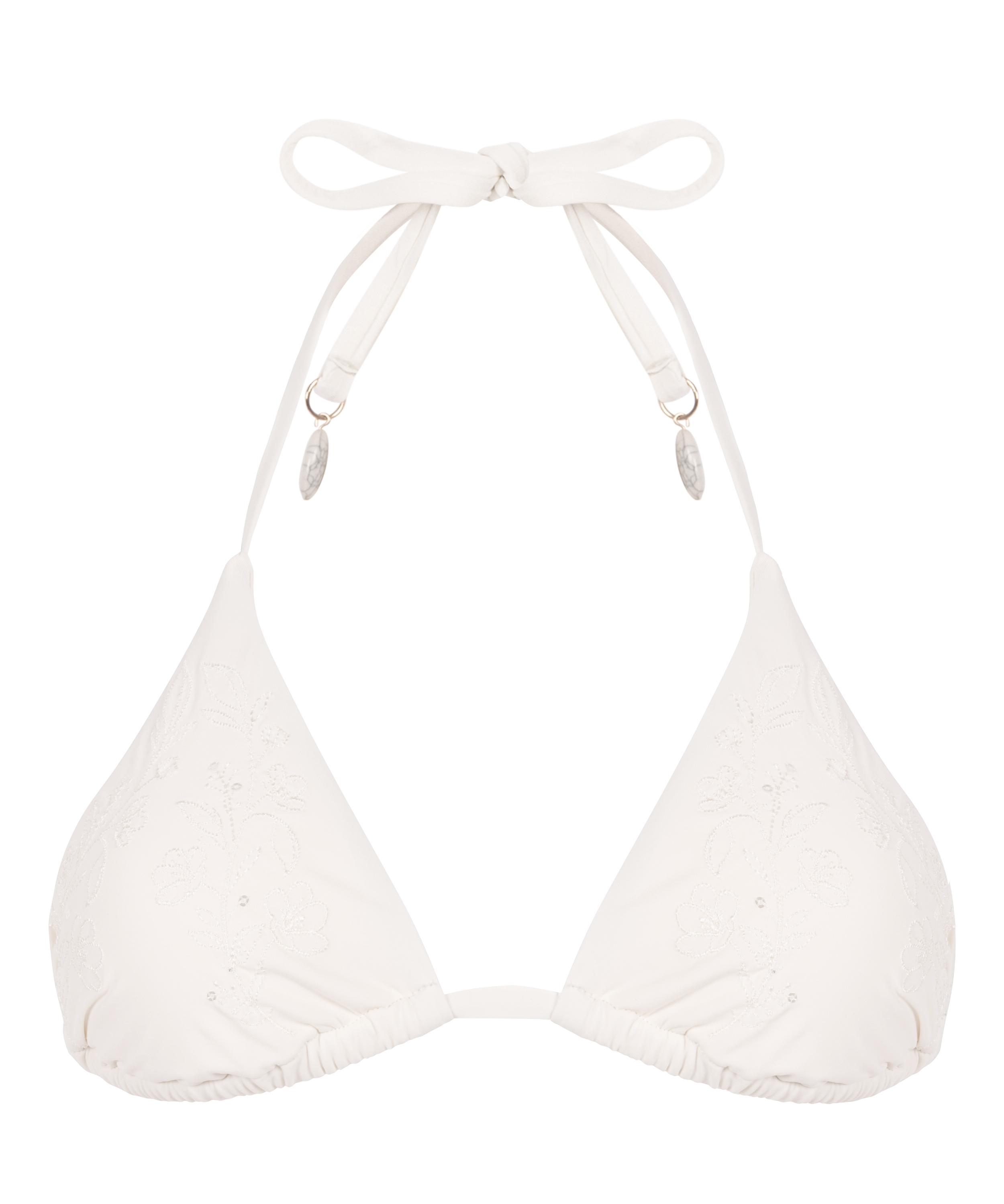 Elevate your swimwear with this delicate triangle top, designed for a flattering and effortless fit. The shimmering flower detail adds a touch of elegance, catching the light beautifully. Pair it with matching bottoms for a coordinated and eye-catching beach look!Our triangles come fully adjustable with halter tie neck and tie back, to suit your choice of cup coverage. However, if you want fuller coverage, try a size up.