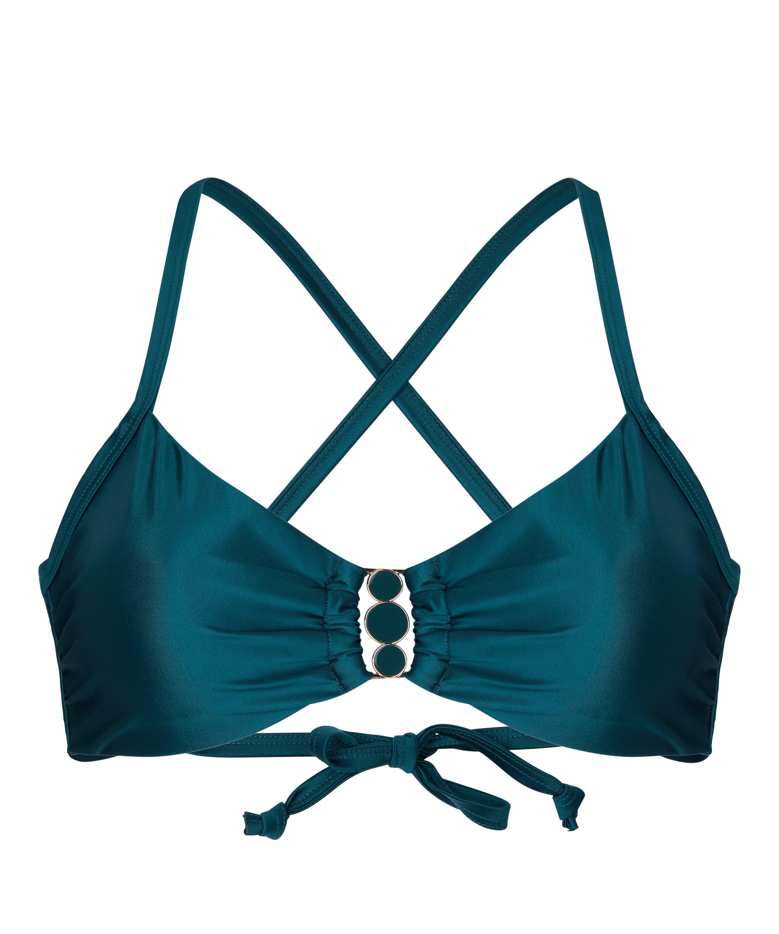 A clean silhouette highlighted by a decorative multiring connector hardware. Smooth edges keep the look minimal, while light padding offers gentle shaping and coverage. Adjustable straps allow a personalized fit. A refined everyday piece that pairs effortlessly with matching styles.