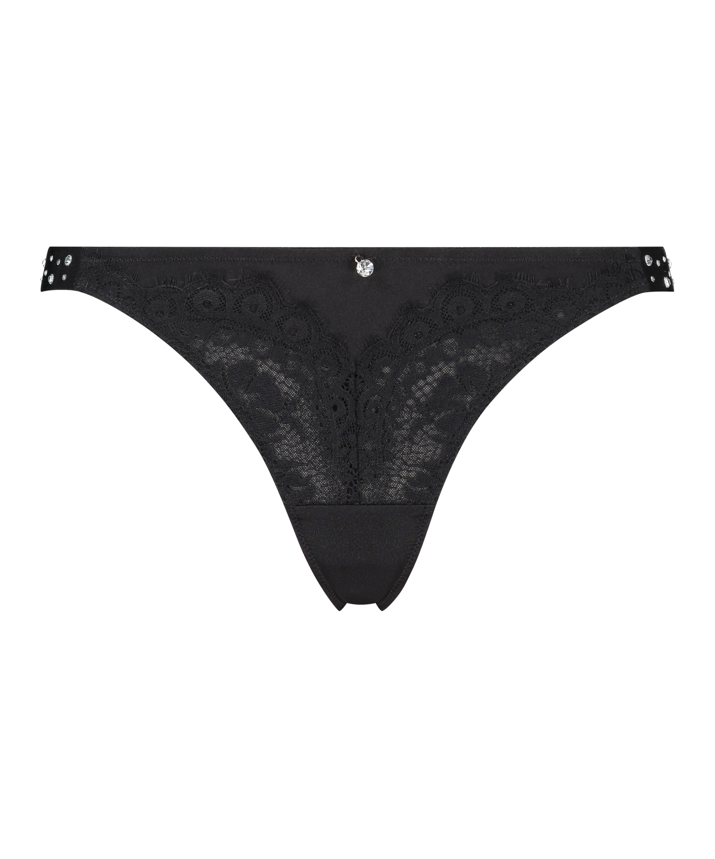 This thong is trimmed with lace and stunning rhinestones. Combine with matching items for a complete set.