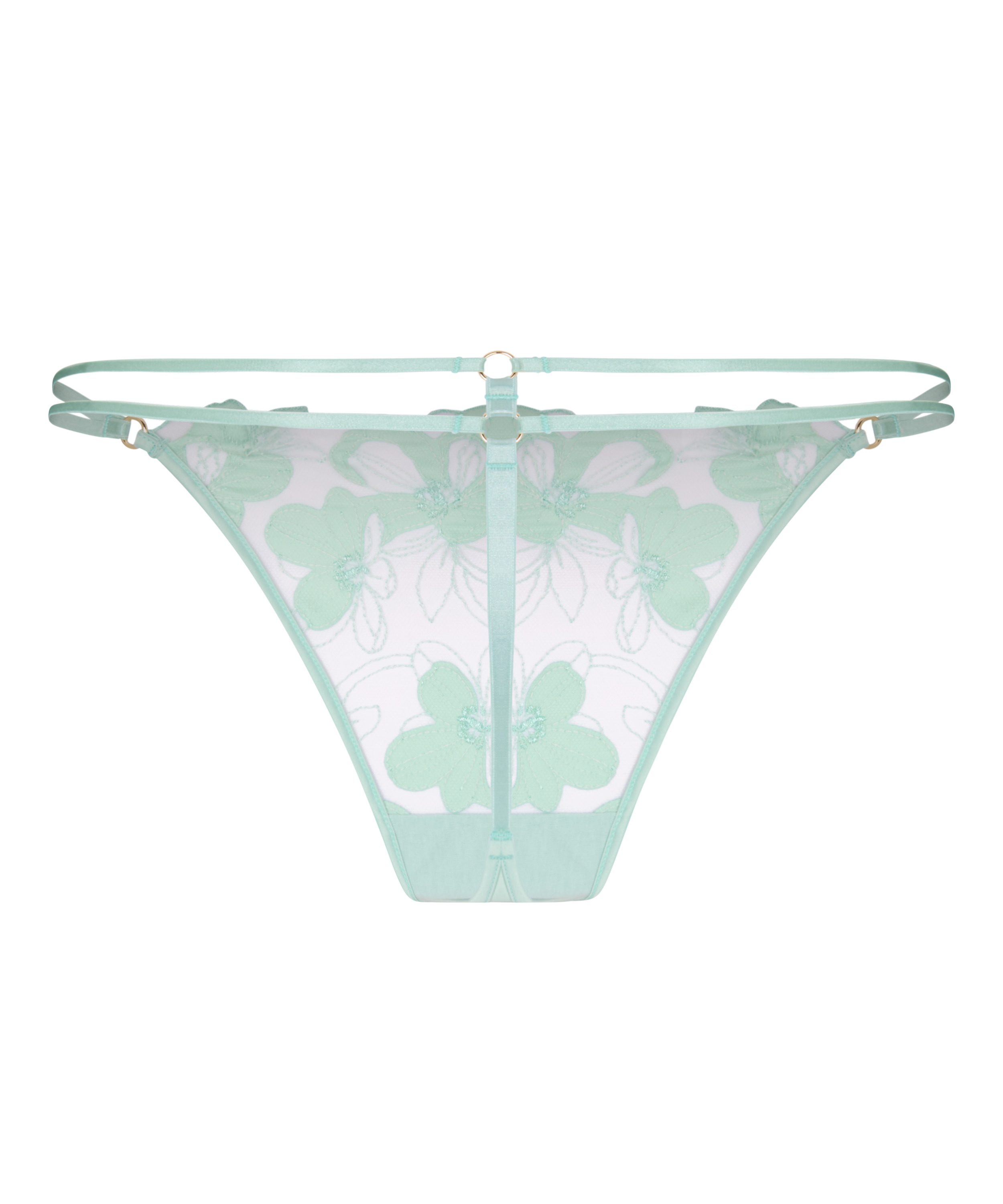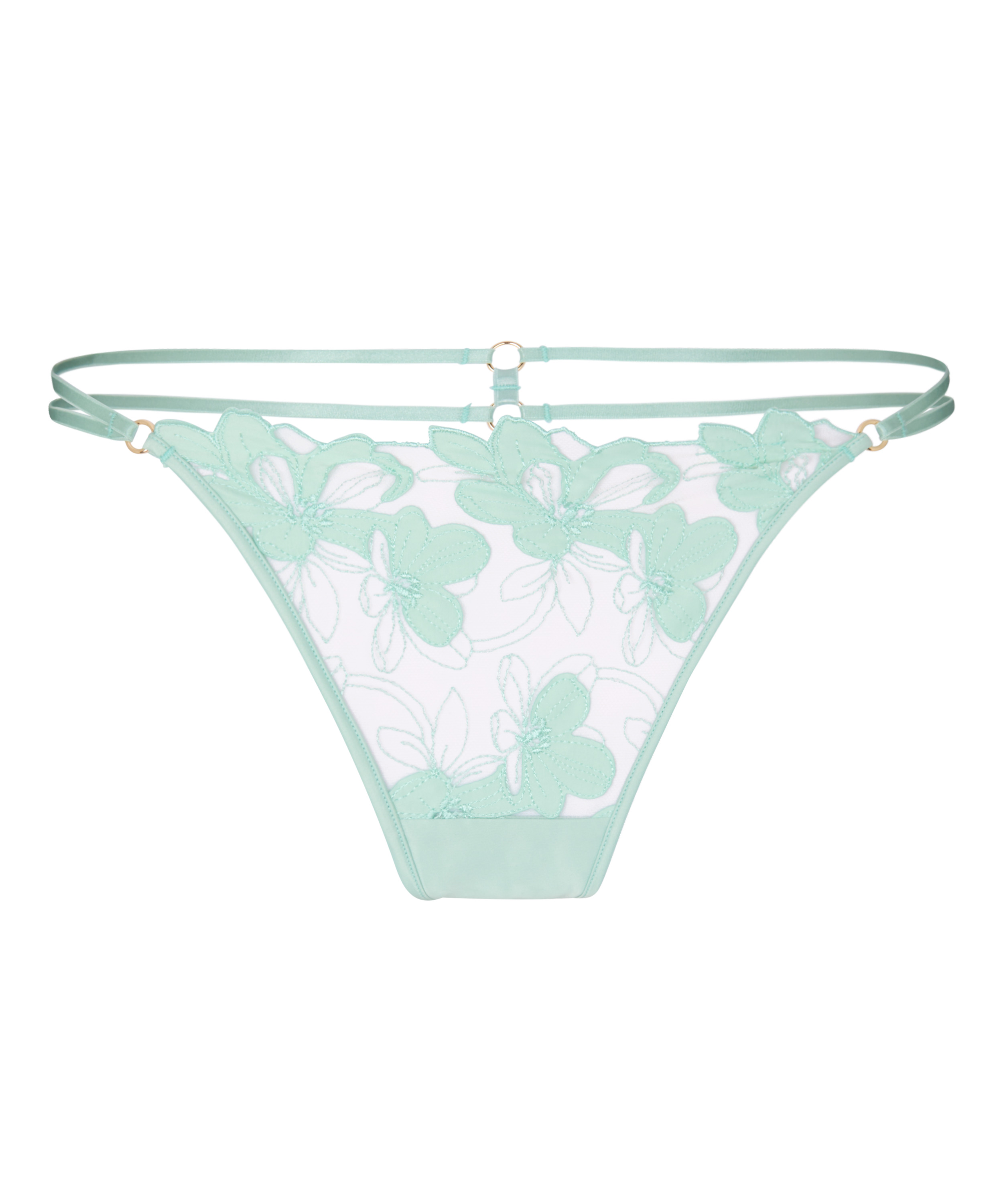 Soft mesh tanga in a light aqua shade with delicate floral embroidery across the front. The semi-sheer fabric gives a light, barely-there feel while the smooth panel adds gentle coverage where needed. A clean waistband keeps it comfortable for everyday wear without digging in. Designed to sit high on the hips and flatter the natural shape. A matching piece for the embroidered bra set, balancing comfort and elegance.