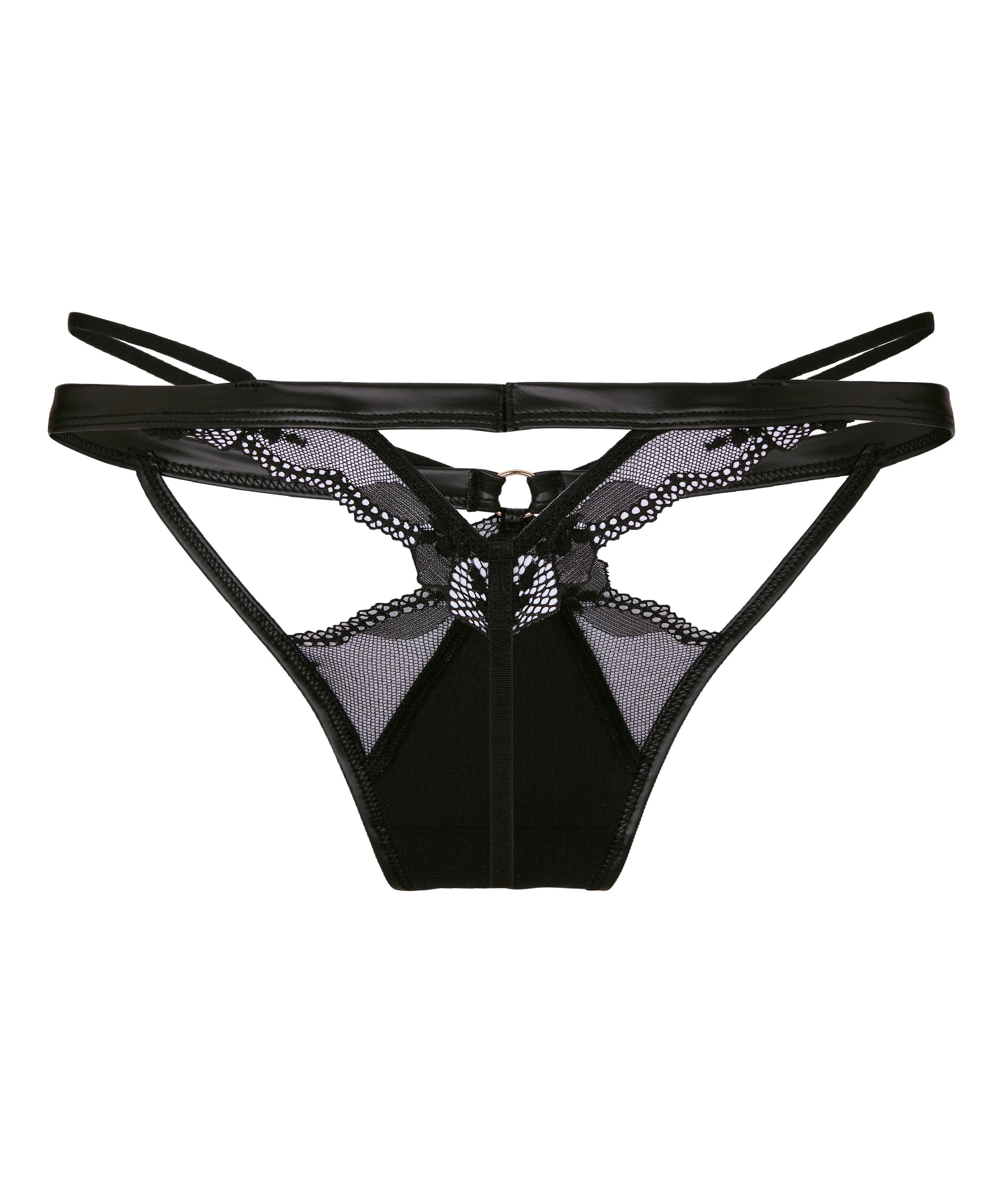 Tanga thong designed with a high-leg cut that elongates the silhouette. The front combines smooth panels with sheer mesh and delicate lace for a refined contrast. Slim strap details at the sides add a modern, strappy look. The lightweight materials feel smooth against the skin while offering a flattering fit. A bold yet elegant piece to pair with the matching bra.