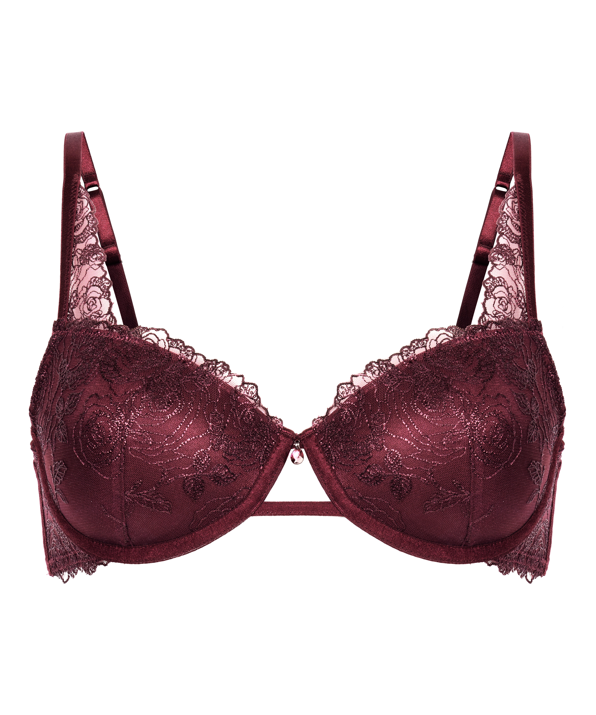 Designed to dazzle, this bra combines structured support with detailing. The cups are padded to enhance your natural shape, while the underwire offers a gentle lift. Made from mesh and embroidered flowers, it's a perfect balance of glamour and romance. Combine with the matching bottom for a complete look.
