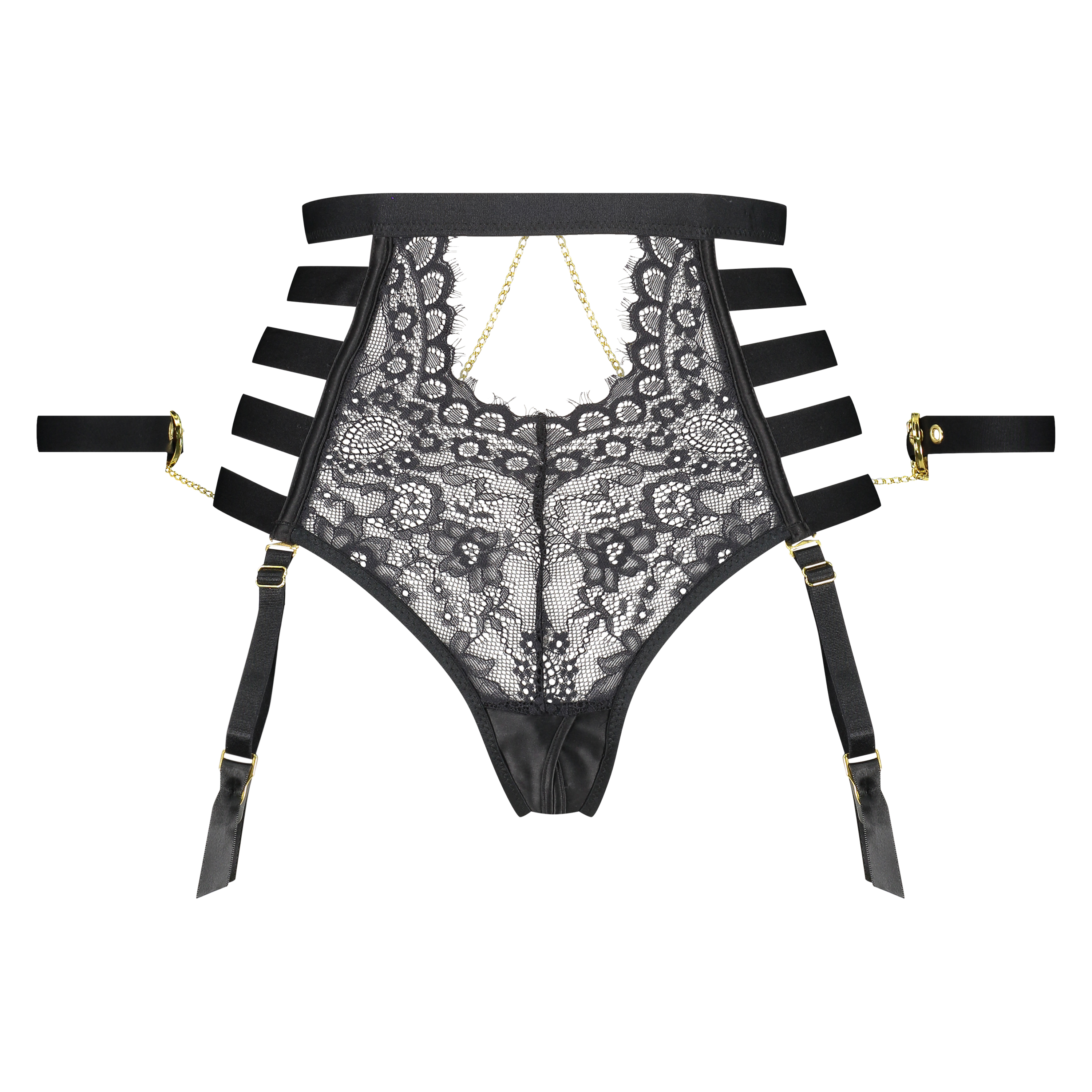 Spice things up with this high-waisted thong! The thong is finished with lace and has strappy details. As a final touch, the thong also has gold-coloured handcuffs, which can be detached from the thong. The knickers have an open crotch. Combine with the matching bra from the Private collection for a complete set!