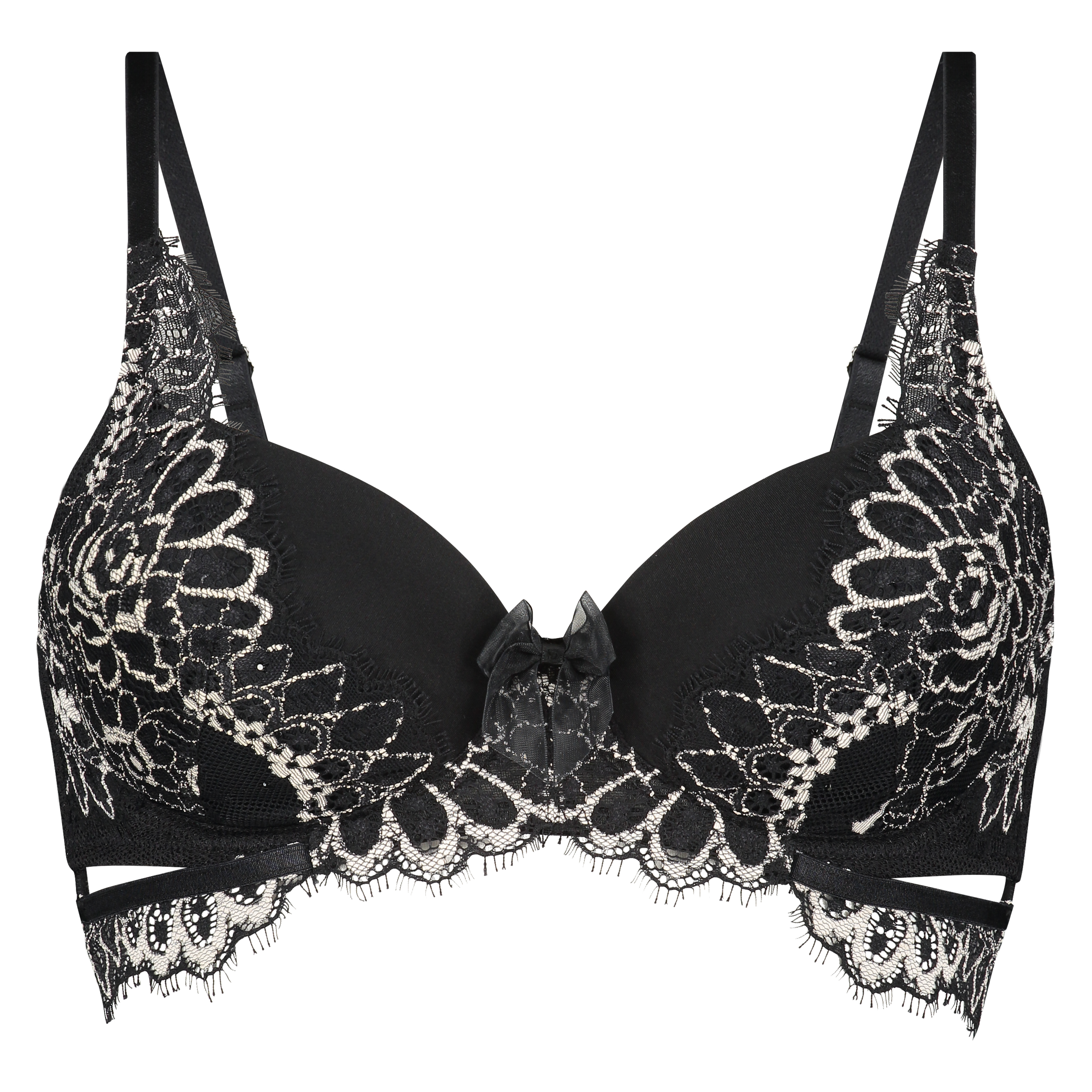 This pretty bra features lace and crystals on the cups and a small bow between the cups. The strappy strap with lace at the bottom adds an extra sexy touch.