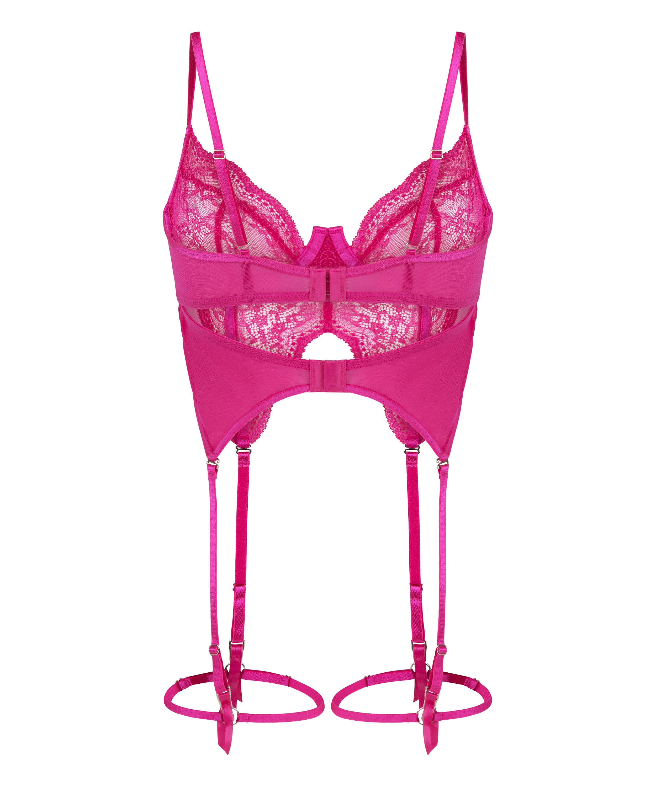 Create an outstanding look with this bustier! This amazing bustier is covered in lace which gives it a semi-transparent look. With sexy suspenders. Pair with matching items.