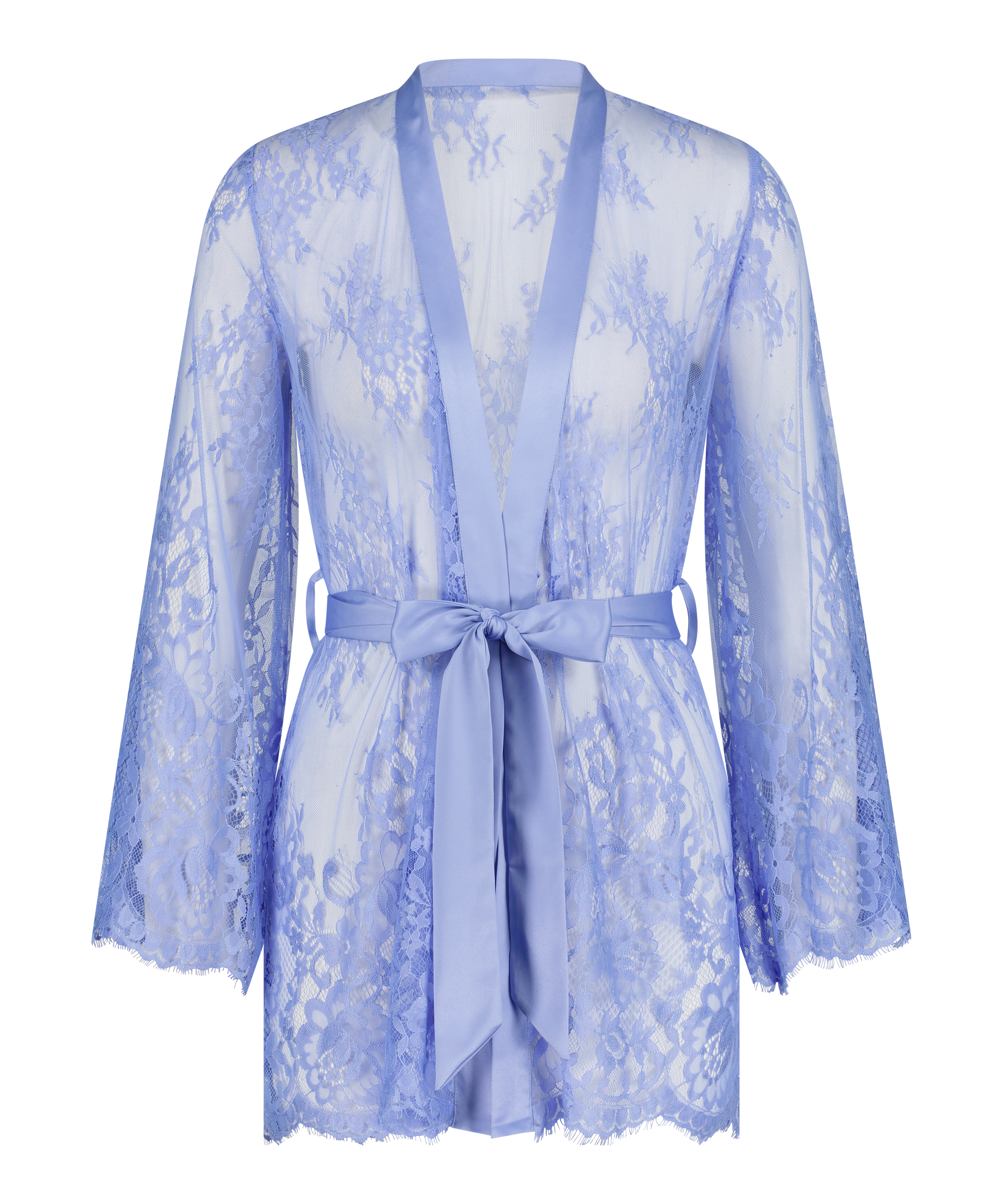 This kimono has it all: sexy, feminine and lots of lace. It is made from transparent lace with satin details and has a button-up front.