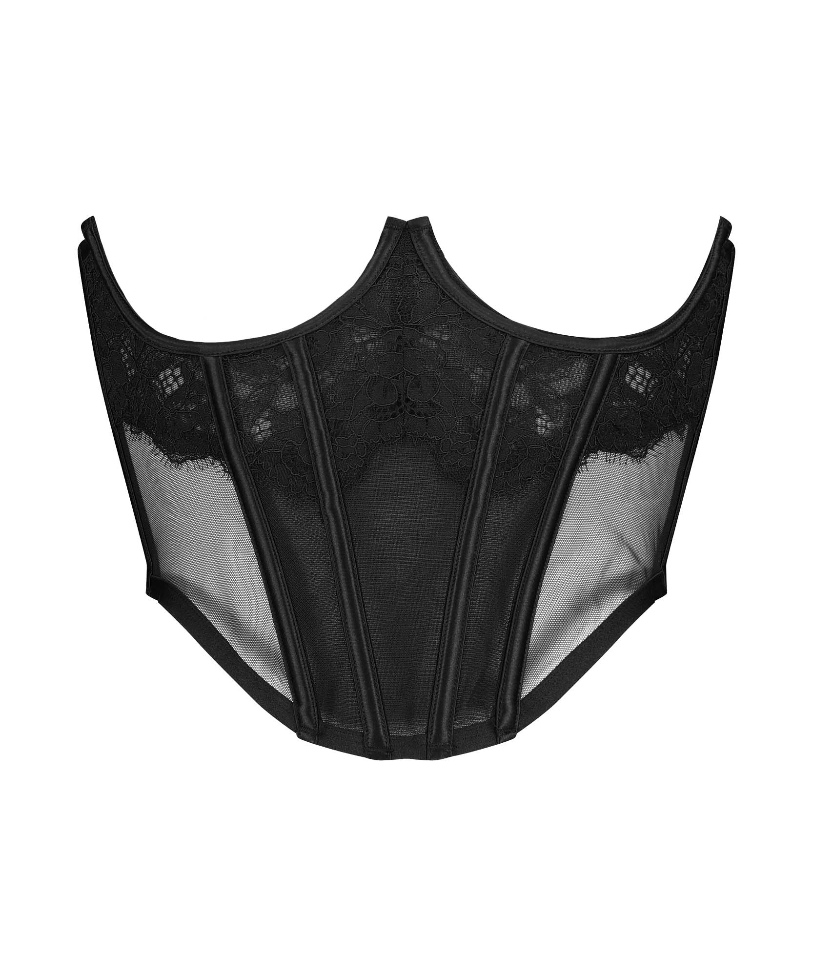 This exciting cupless bustier leaves little to the imagination. This bustier is elegantly and beautifully finished with lace, transparent mesh and has a hook-closure on the back. Wear with the matching items for a complete look. Part of the Kim Petras collection.