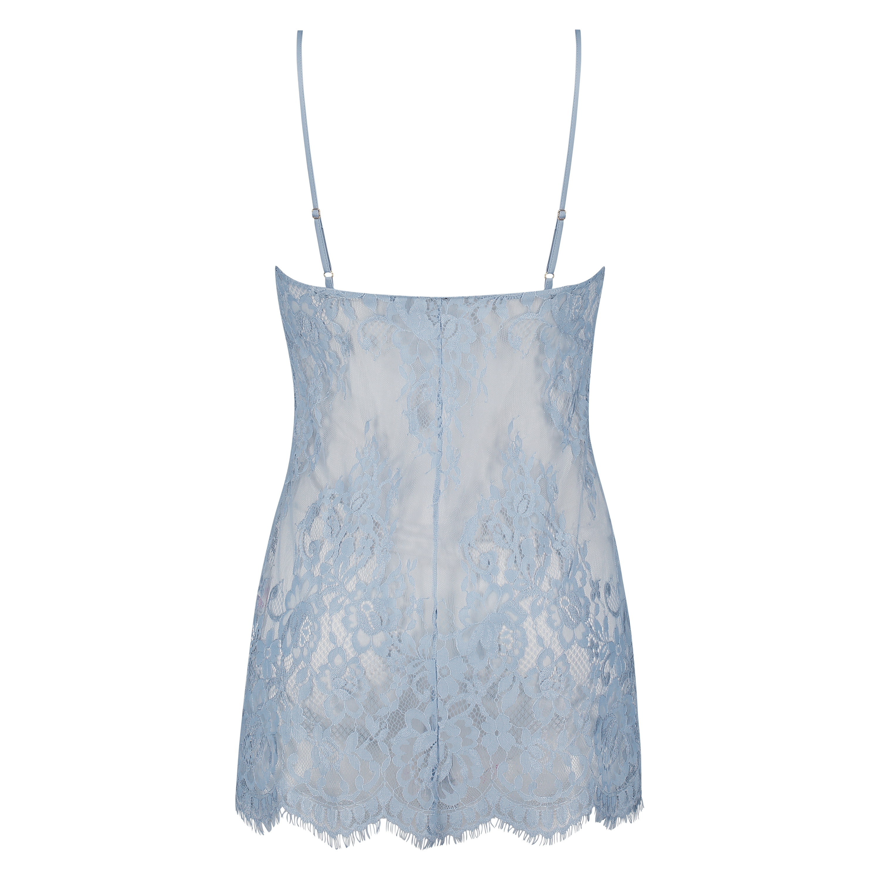 Feel sexy in this slip dress with a satin look and feel and semi-transparent lace on the back and sides. Combine with a pretty kimono for a complete look.