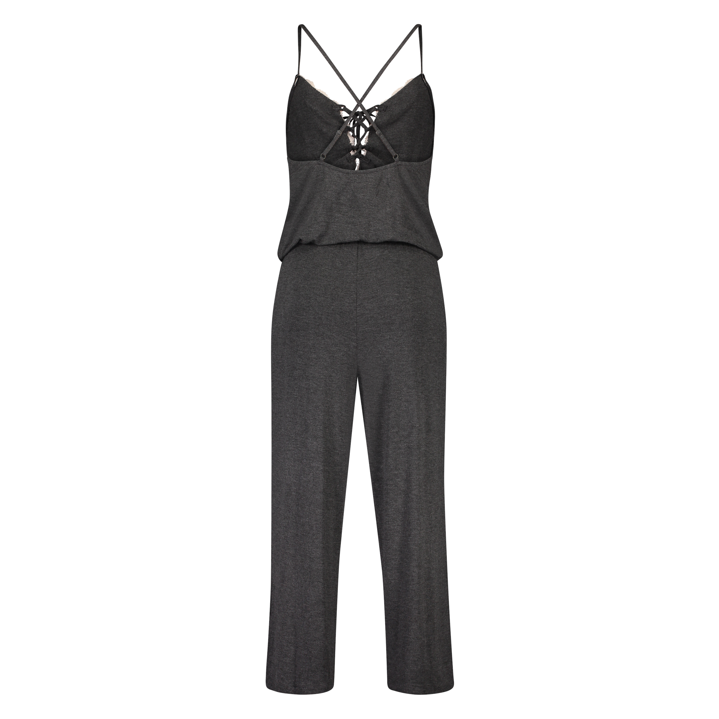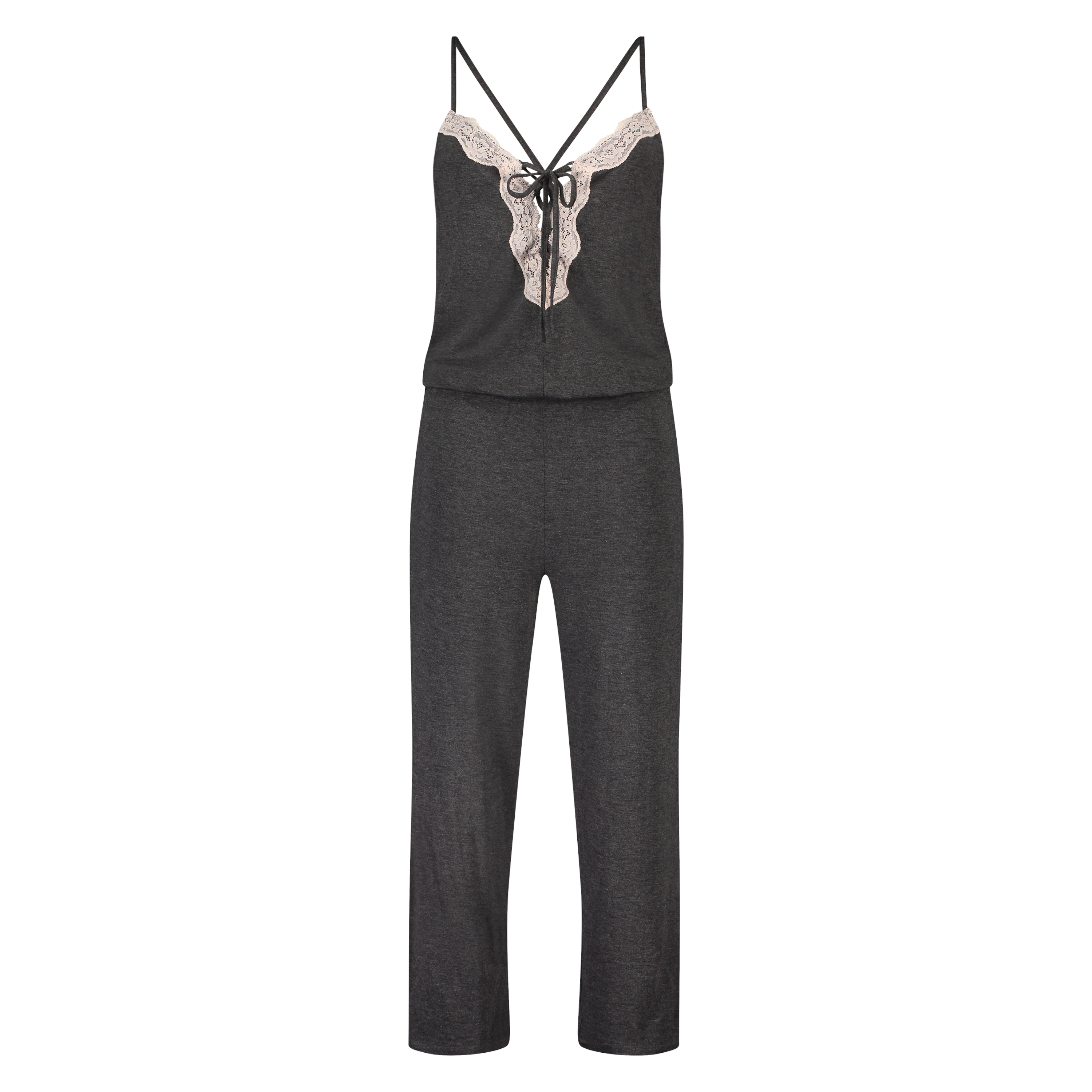 This super comfortable onesie is made from soft fabric and finished with pink lace, lace-up details. The straps are crossed on the back.