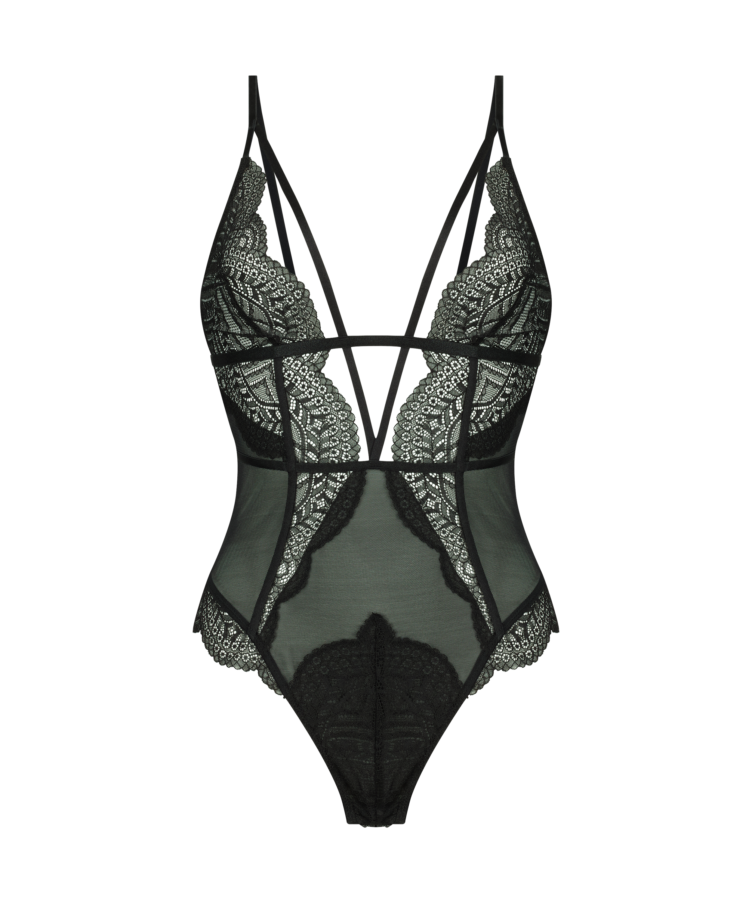 Feel amazing in this unpadded body! It is semi transparent, with lots of lace decorations. On the front and back there are cut out details and sexy strappy details. Pair with a kimono to complete the set!